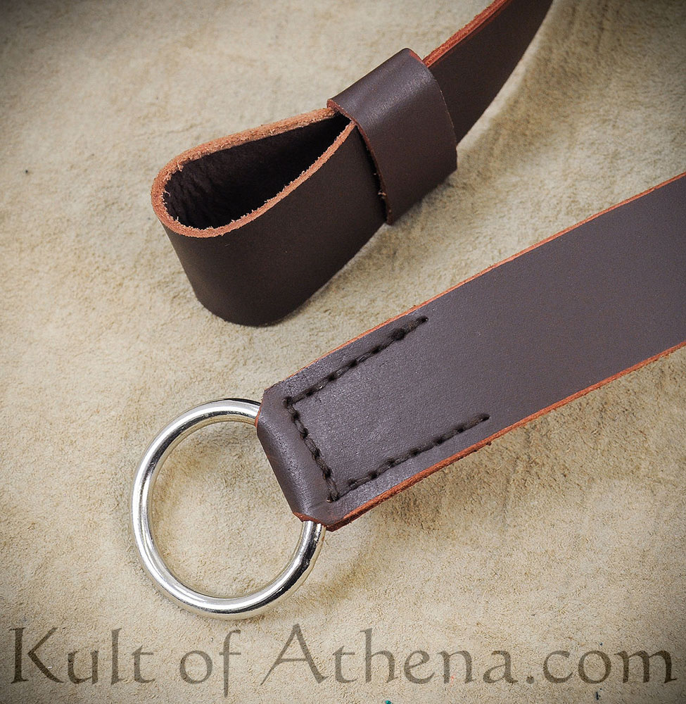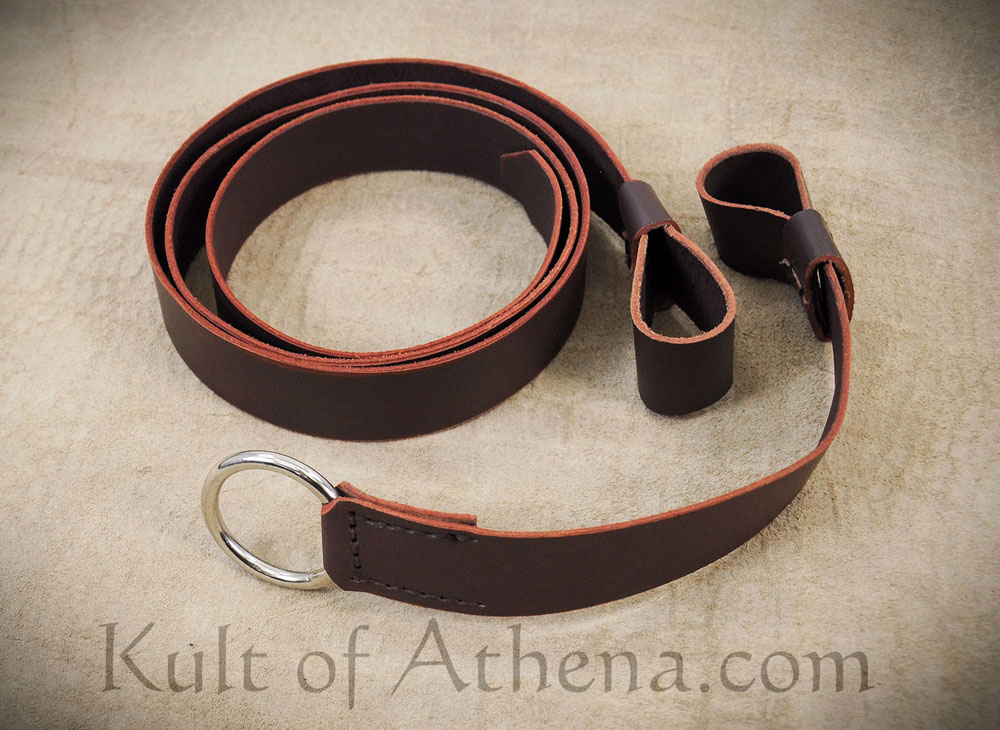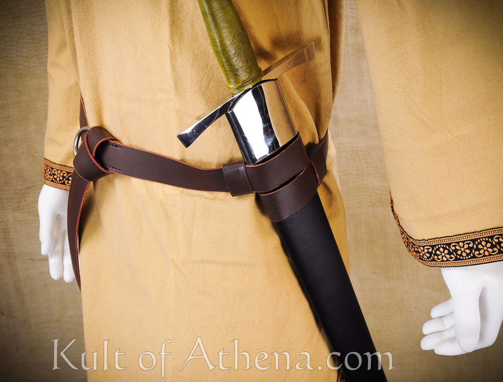 This double strap sword belt is a two-part design that integrates a sword scabbard directly into the circumference of a sword belt. It is crafted from stitched brown leather and fitted with steel ring buckle.