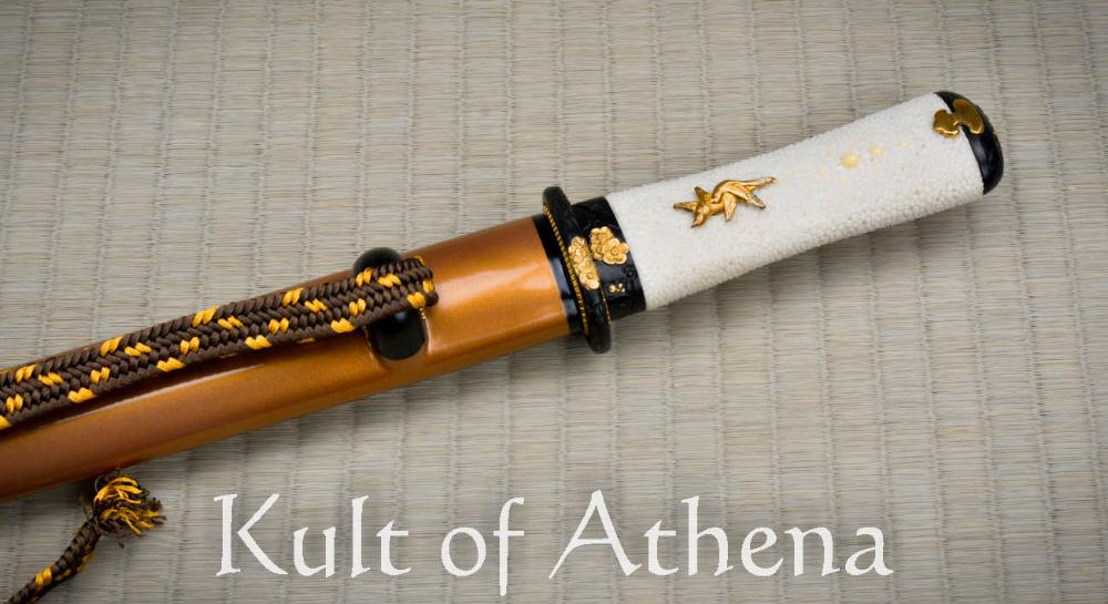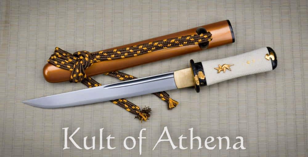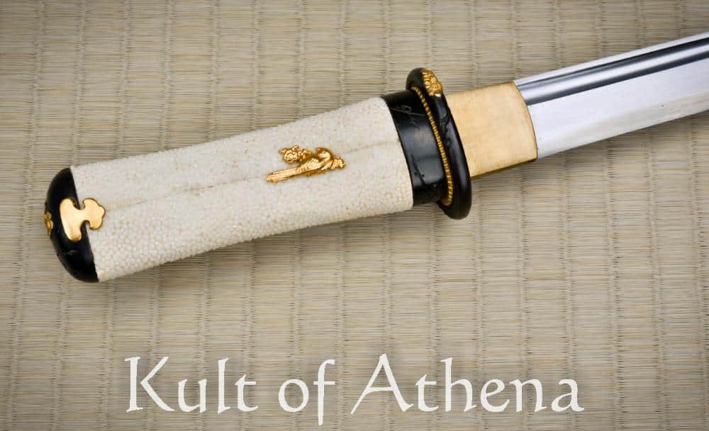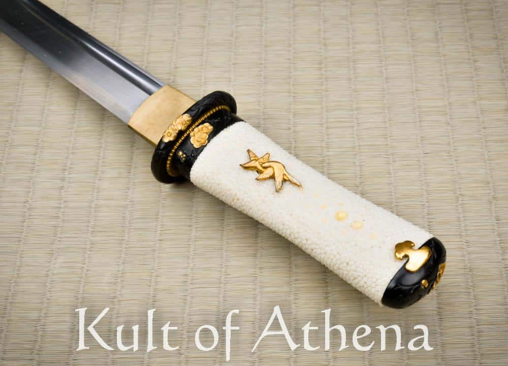Beautiful and functional with a plum blossom motif,  this tanto is light in the hand and grips firmly with nodes of the ray skin.  Finely detailed,  gold plated oriole menuki and accents demonstrate Frenchie’s keen attention to detail on all Dragon King designs.  The gold saya and brown and gold sageo match beautifully and would make the Baika Tanto a great companion piece to the Tatsumaki Katana SKU: SD35120