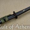 The differentially-tempered 1566  steel blade features a real hamon line with a copper habaki and seppa.  The tsuka encapsulates the tang in textured G10 and is dual pinned for a secure grip. The silver menuki on the tsuka are shi shi (lion dogs) which are embedded in the handle.  The textured black saya features an olive paracord sageo around a polymer kurikata and kojiri.  The Modern Katana also has the Modern Tanto as a companion piece to complete a matched modern warrior collection which is available separately.
