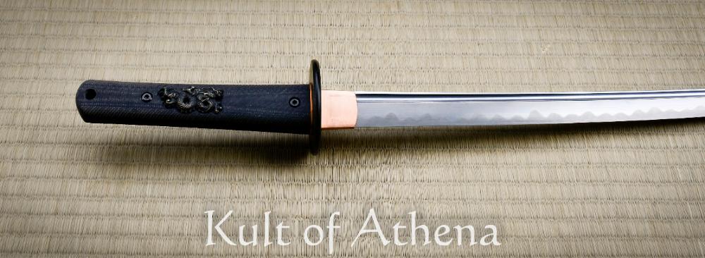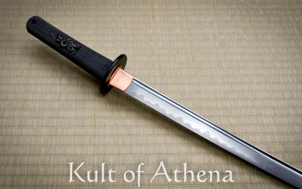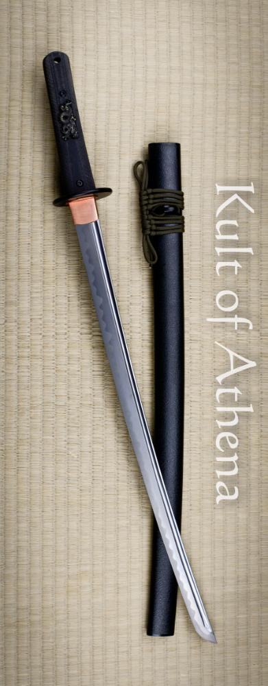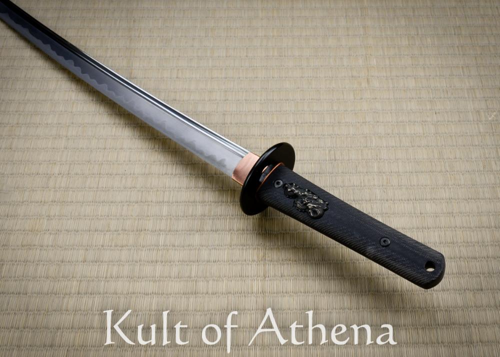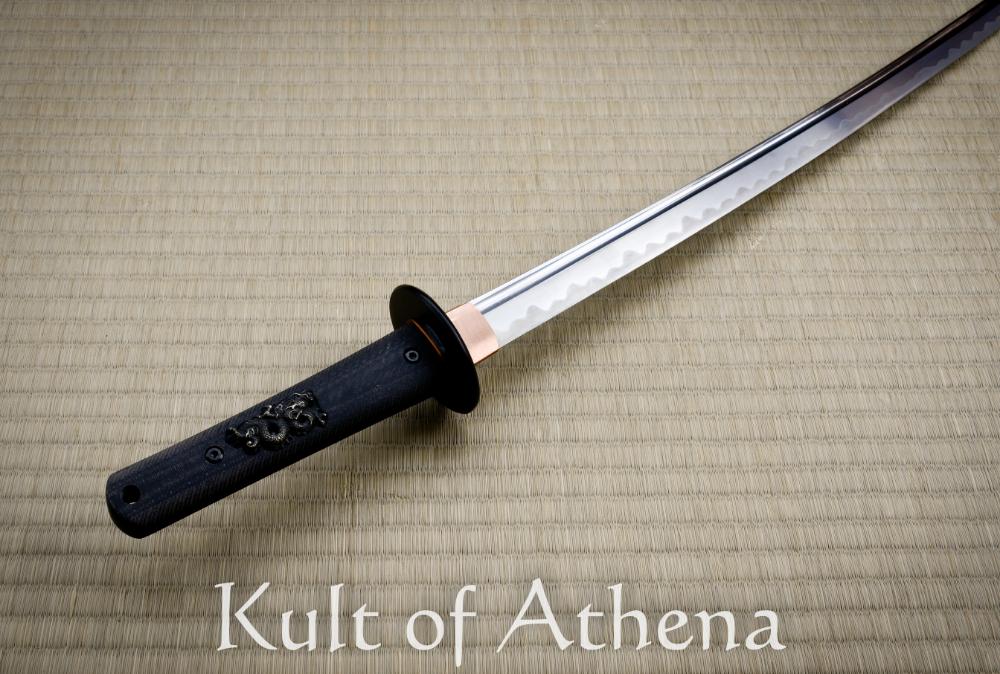 The differentially tempered 20” 1566 steel blade features a real hamon line with a copper habaki and seppa.  The tsuka encapsulates the tang in textured G10 and is dual pinned for a secure grip which is unremovable.  The silver menuki on the tsuka are dragons which are embedded in the handle.  The textured black saya features an olive paracord sageo around a polymer kurikata and kojiri.  The Modern Katana also has the Modern Tanto as a companion piece to complete your modern warrior collection.