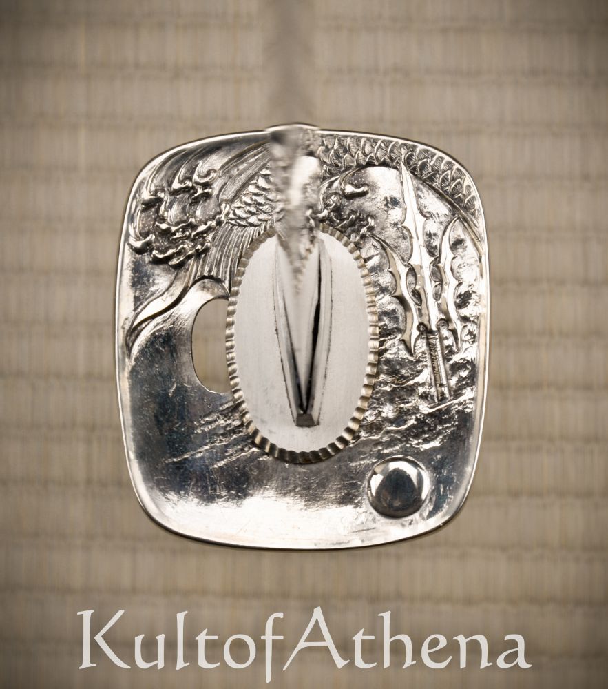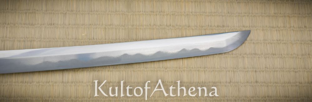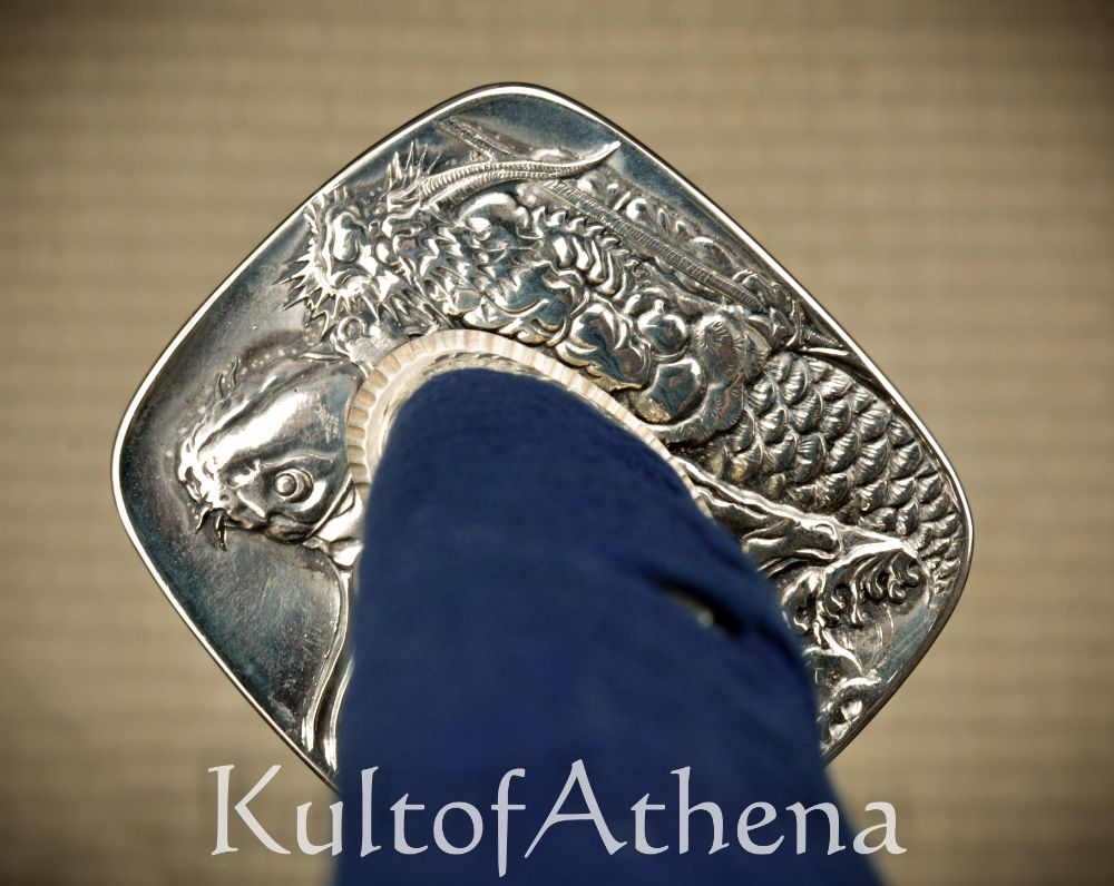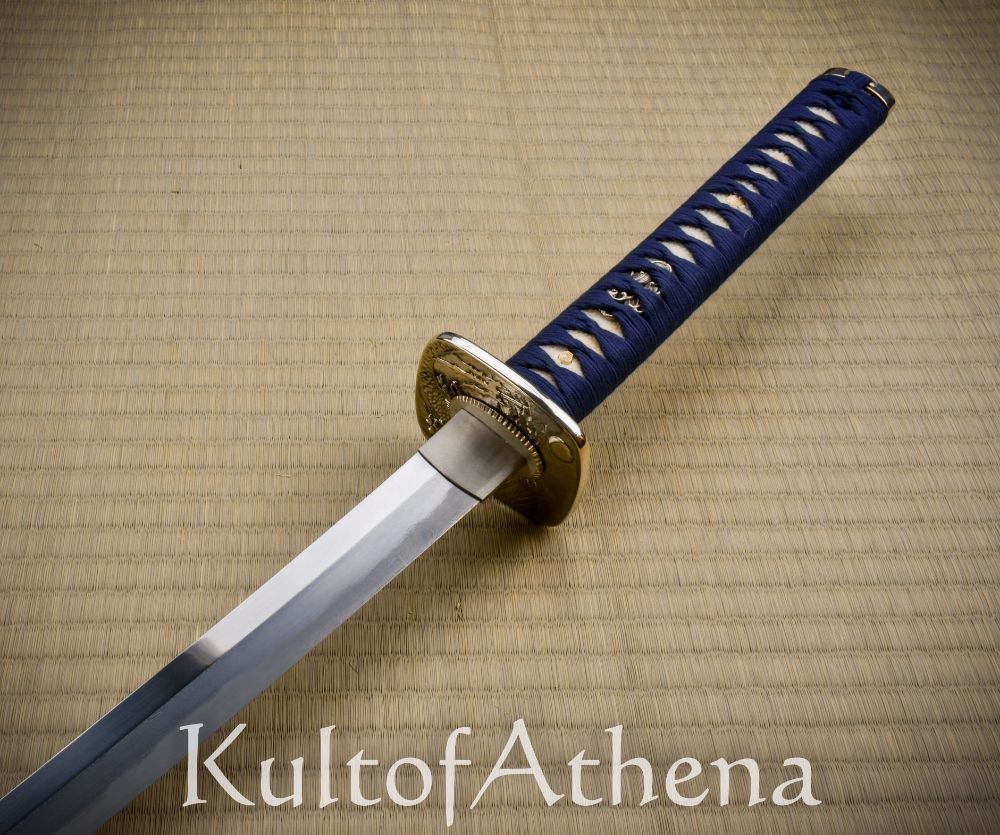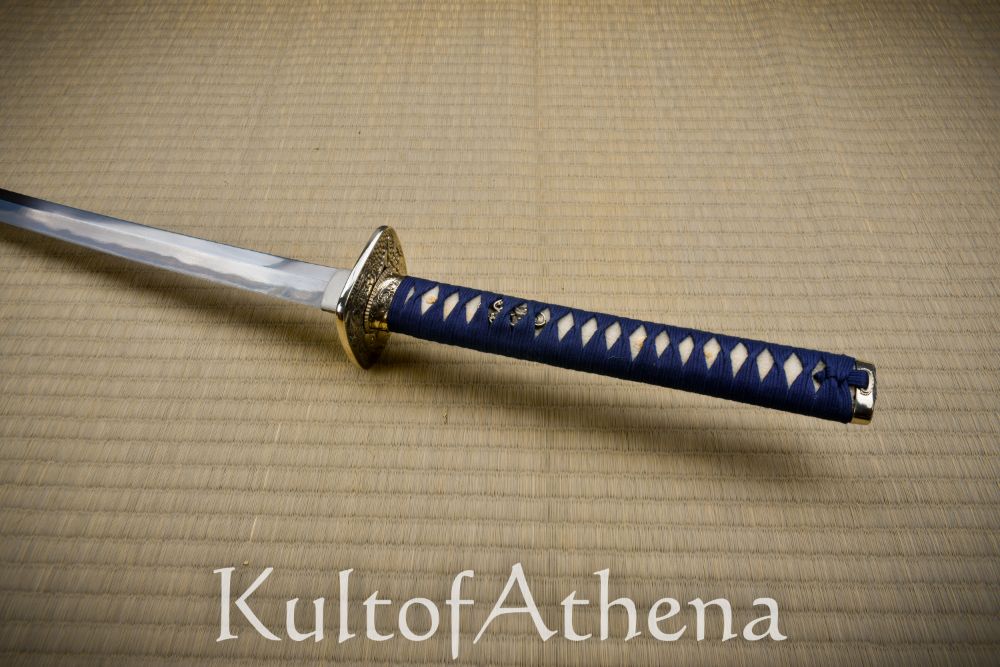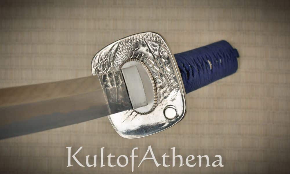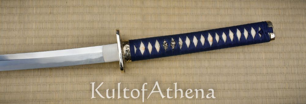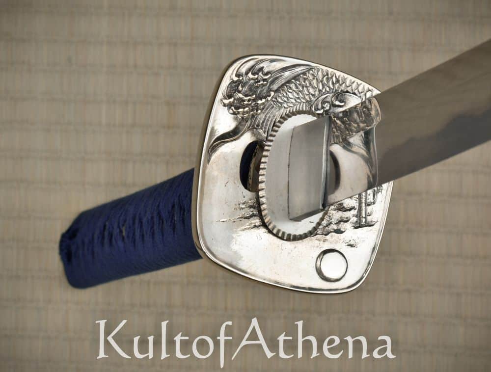 Exclusive to Kult of Athena! The Yaksha Katana from Dragon King is a premium katana with a blade of folded T10 and 9260 high carbon steel which was differentially clay tempered in the traditional manner to imbue it with a genuine hamon of hardened steel and a shock absorbing blade body and spine. The tsuba, fuchi and kashira are all highly detailed in well-cast cupronickel with a brilliant silver-like finish and these are matched with a silvered habaki and seppa. The hardwood grip has panels of genuine, quality rayskin which are overlaid in well-knotted dark blue silk ito cord.