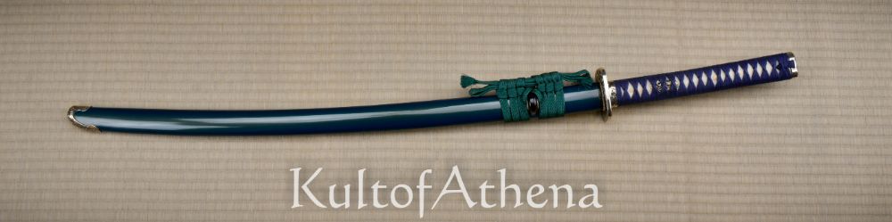 The sword is matched with a hand-carved wooden scabbard which is finely lacquered with an iridescent sea-green saya complete with polished horn fittings and a tip of matched silvered cupronickel. A silk sageo of green completes the sword and scabbard and a cloth sword bag is included.