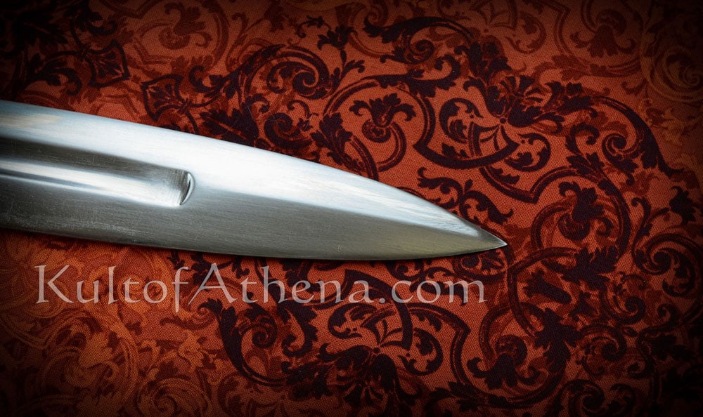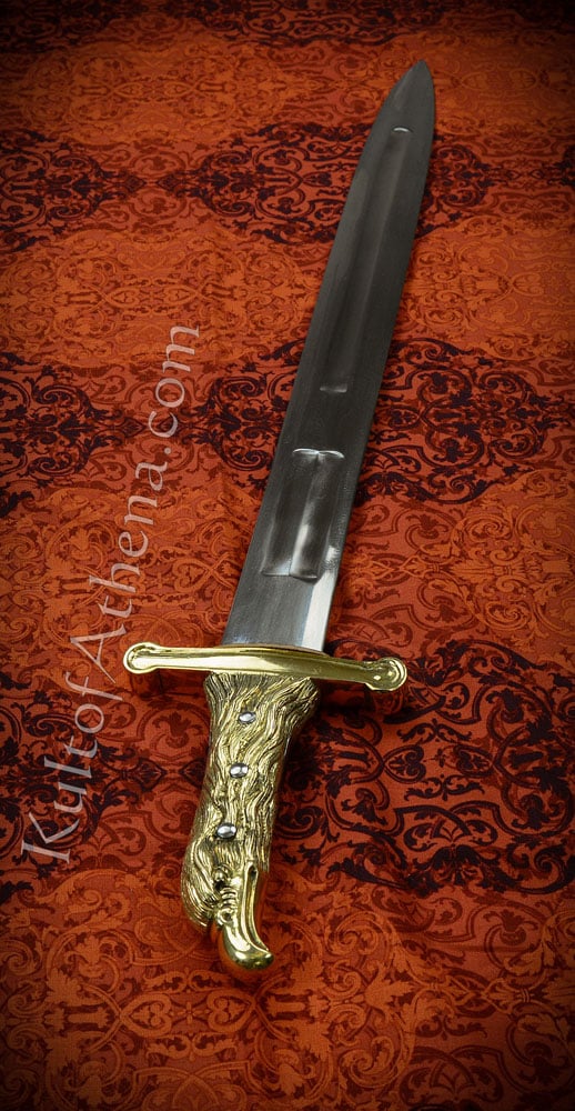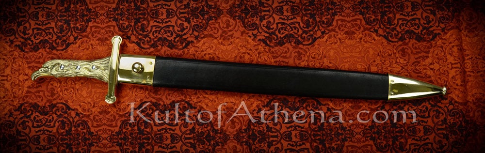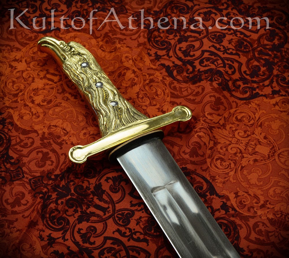 The Eagle Headed Talabot is an artillerymans sword with a blade forged from EN9 high carbon steel. The hilt is brass and is steel-pinned to the thick tang to give the sword a very durable construction. The scabbard is of thick leather with a protective brass locket and chape.