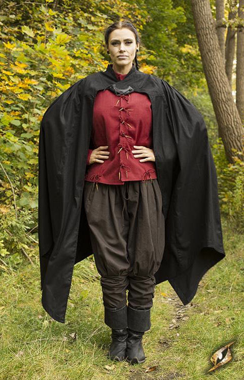 The Edrahil Cape is a powerful cut with longer sides. Secure the cape by overlapping the collar in front of the neck and tying its leather ties through the top leather patch.