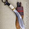 This gorgeously handcrafted Khukuri was forged by EGKH in Nepal; robustly crafted with a blade of tough and well tempered 5160 high carbon steel, the Khukuri is fully functional and capable of delivering fierce cuts and chops. Among its detailing and embellishment the blade has five fullers expertly ground into each side of the blade. Its five fullers lighten the blade without sacrificing structural strength, while also giving it a distinctive, traditional aesthetic. The thick spine and forward bias concentrate mass toward the blade’s leading third, allowing this compact khukuri to bite deeply into wood, brush, and cutting targets with impressive authority for its size.