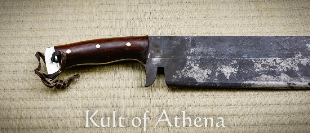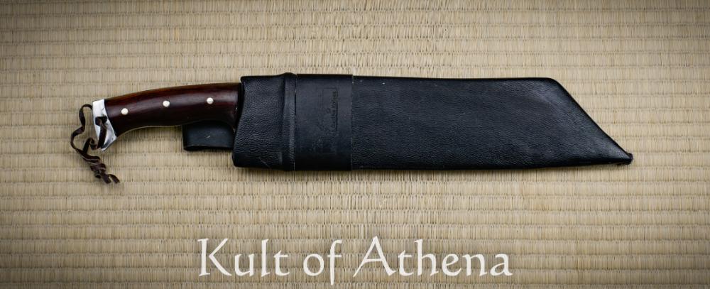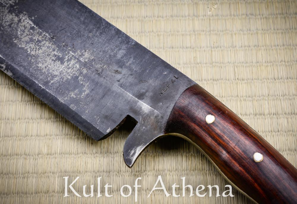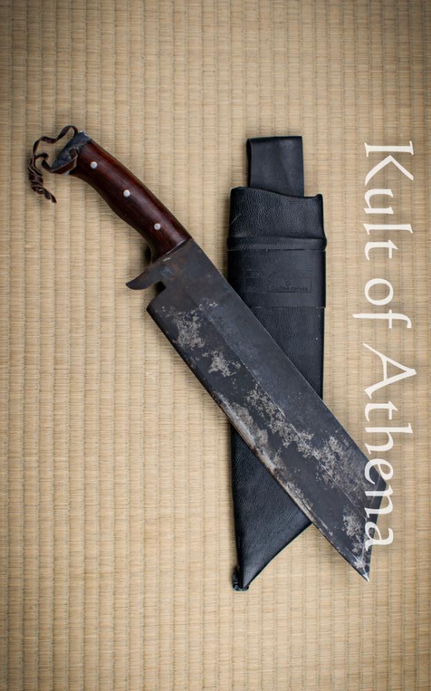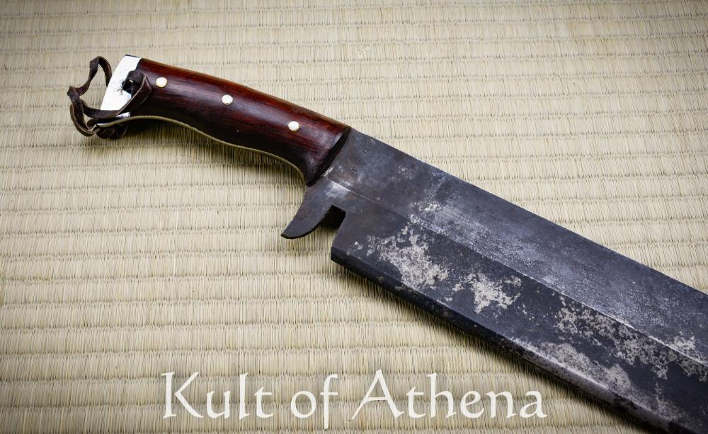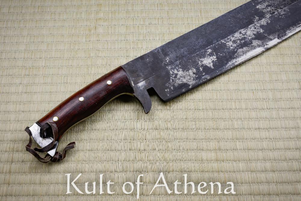 This exceptionally wide-bladed, cleaver-like short sword is built to handle heavy bushcraft and camp duties, but it serves just as well for the backyard cutting enthusiast who wants to deliver very powerful cuts, chops and hacks to their targets. In a pinch it serves as a rather imposing tool of self defense out in the wild. The thick spined 14.5 inch blade is capable of splitting and cleaving through the heaviest of targets and is forged from tempered 5160 high carbon steel with a hollow ground blade geometry to reduce weight whilst keeping its thick spine to give it mass to power through heavy strikes. The blade was left rough-polished to keep a rustic appearance and a moderate amount of rust resistance.