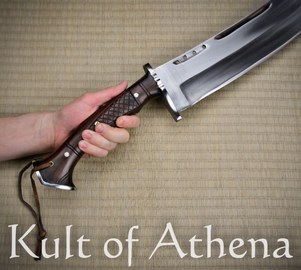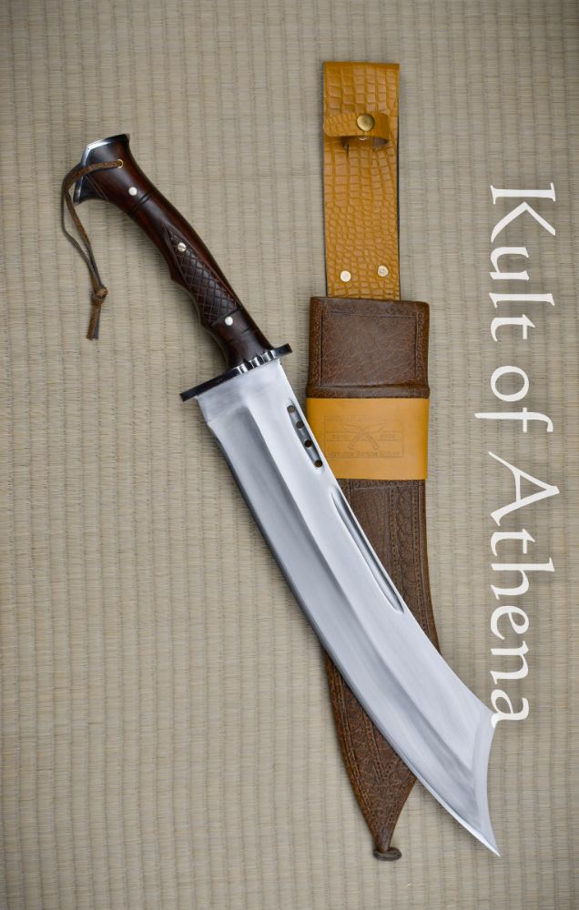 The short sword is crafted as durably and tough as possible with a full tang construction consisting of polished scales of rosewood which are triple-riveted to the thick blade tang. The guard and pommel are steel and the hilt is finished with a leather wrist strap. The high quality scabbard is crafted from wood which is bound in leather and completed with a faux leather belt frog and belt loop so that the sword can be worn vertically