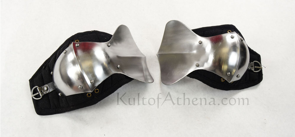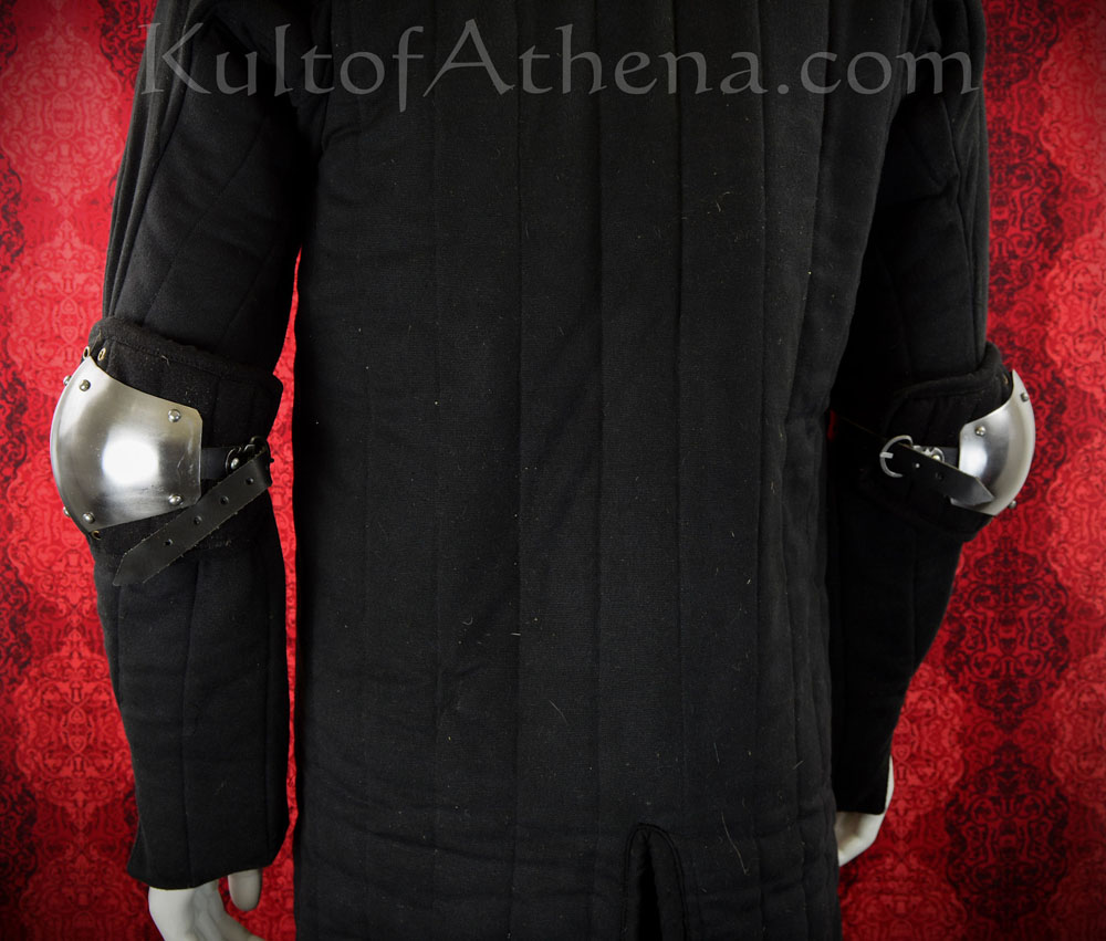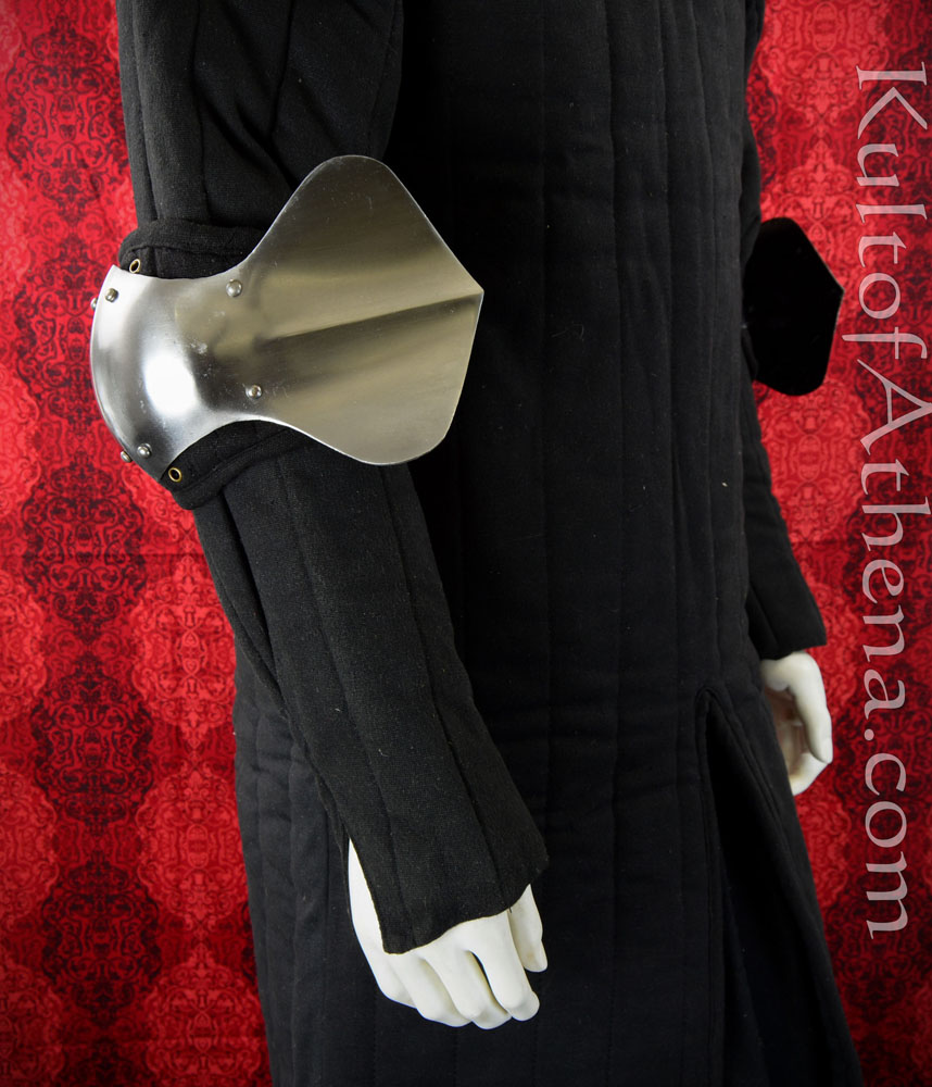This pair of couter armor which provide armored protection is crafted from plates of 16 gauge steel; they are riveted to a backing of quilted and padded cotton. This material and make of this padding is identical to they type used to make gambesons, coifs and other padded armor. The cotton and padding are organic and will ventilate better than poly-fill padding.