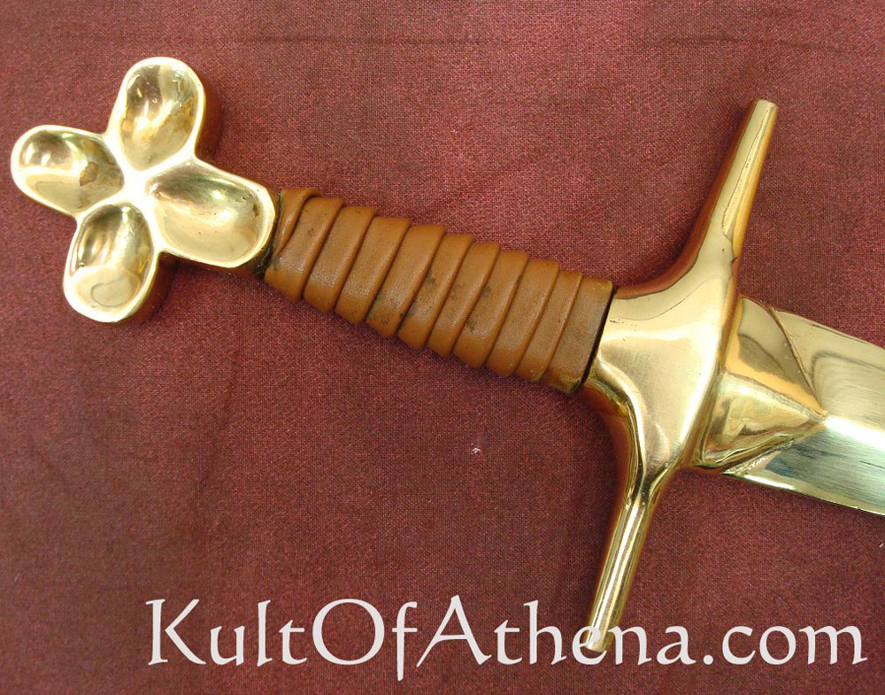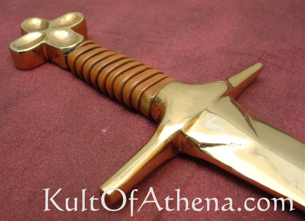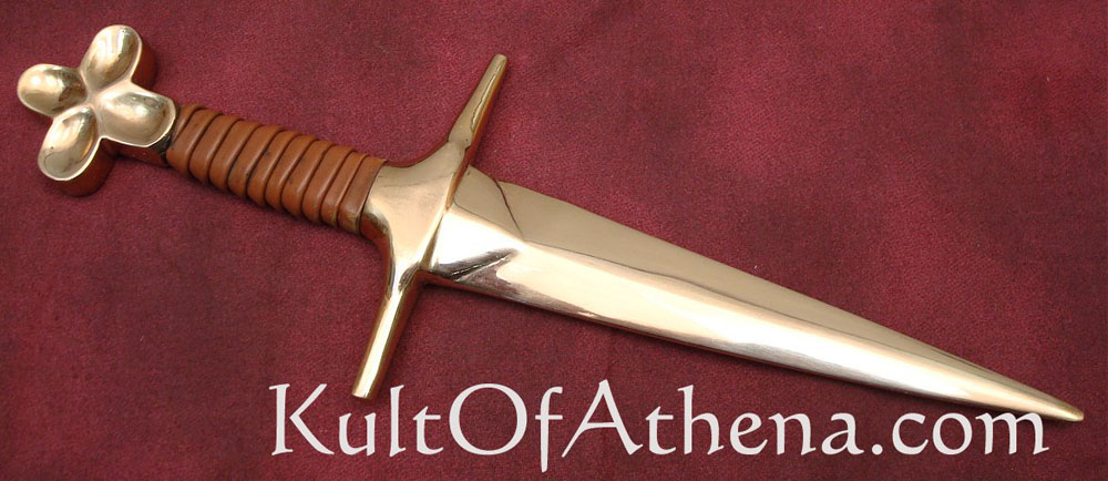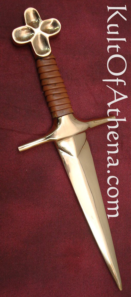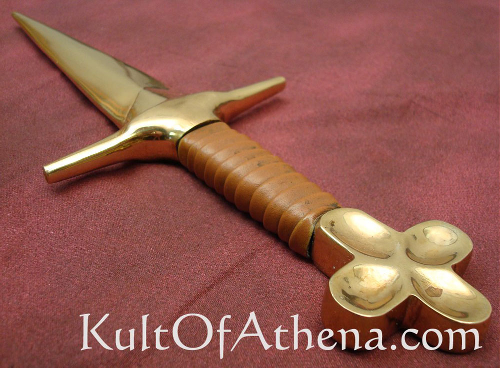 The Elizabethan Bronze Dagger is constructed of solid cast bronze with a brown leather wrapped grip. The thick blade is unsharpened.