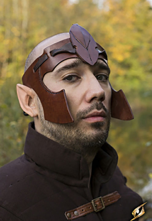 This bestselling Epic Armoury Elven Head Band is a slim decorative piece of head armour with a distinct elven feel. The headband is made from vegetable-tanned leather and fitted with an adjustable leather brace at the back. At the forehead, the headband is decorated with a flat leaf-shaped leather patch that rises over the forehead and stretches down to cover the bridge of the nose. At the temples it is fitted with cheek-pads closely covering the cheek and chin-bones, hovering a few centimetres before the mouth.