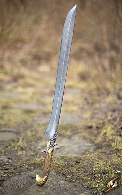 Epic Armourys Elven Sword is a a latex-hybrid curved blade for the aspiring Elven hero or Dark Elven villain. The sword is 85 cm long from tip to pommel, with a gently curved 60 cm single-edged blade. The detailed crossguard curls back over the blade and toward the handle, shielding and protecting the hand. The handle is 11 cm long, cast and painted to look like real wood with inlaid metal embellishments.
