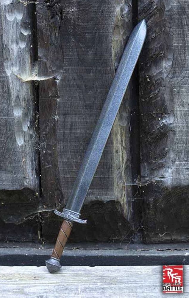 This Ready For Battle Errant is an effective fantasy sword of medium size. It is 75 cm long with a short ricasso near the crossguard meant to protect the fingers from being sliced during certain historical sword maneuvers. The blade is superbly balanced with a 15th century English-inspired pommel and an ergonomic handle below a curved crossguard. The handle is sculpted and handpainted to appear like wrapped leather, but does not require leather care. Ready For Battle weapons are moderately styled and cost-effective weapons that are perfect for new and young players. This RFB Errant is one of our hybrid models, featuring a handle cast in polyurethane foam that allows for greater detail and no maintenance. The blade is made from closed cell foam around a fibreglass core and finished with a strong latex coating.