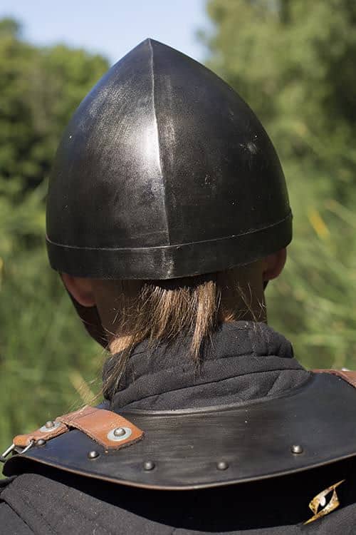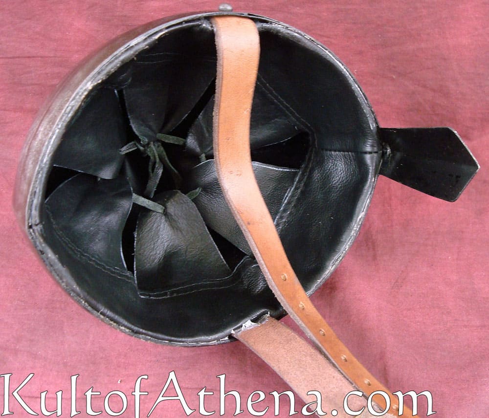 The classic Norman Helmet, but better… This helmet is made with a new metal finish that we call Epic Metal. This gives the helmet a rugged, textured look, like it has been around for ages. The steel is not shiny, but rather a dark silver color. The dark metal also protects against rust and is very durable. Our Epic Norman Nasal Helmet is completely padded and lined on the inside, there is no need for an arming cap. This helmet also has a adjustable chin strap. The padding consists of thick strips of foam, if you need to make the helmet bigger, you just take out some of the strips. If you need to make the helmet smaller, than simply add insert them in the leather liner. Very simple and extremely comfortable. This method gives you the perfect fit and prevents the helmet from sliding around. Available in Medium or Large.