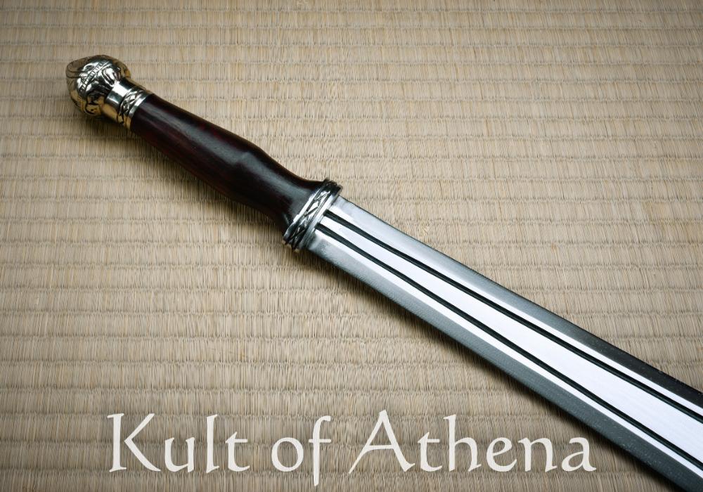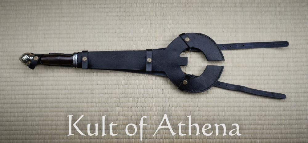 The thick full tang is anchored and riveted solidly into a 4 5/8-inch hardwood grip that is shaped for secure handling and affords the bearer plenty of leverage for powerful cuts and strikes. Included with the sword is a stitched leather sheath equipped with buttoned retaining straps, allowing the blade to be carried securely while protecting its edge.