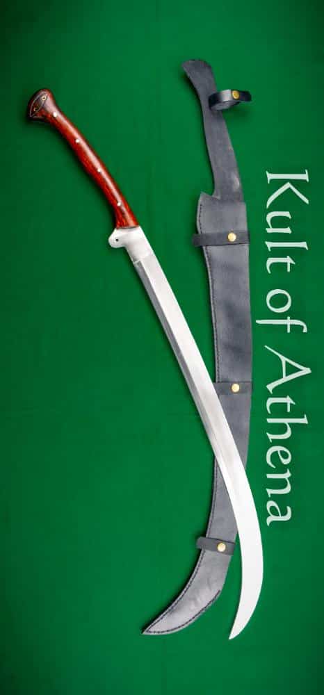This replica of the famed weapon has a blade of 5160 high carbon steel; its thick blade spine gives it plenty of mass to aggressively power it through forceful chops, hacks and sweeps. The construction of the sword is quite strong with its thick, full tang construction composed of grip scales of polished wood riveted directly to a thick steel tang. Included with the sword is a thick sheath of stitched leather complete with buttoned retaining straps and two sets of belt loops that may allow for it to be worn with a baldric (not included)