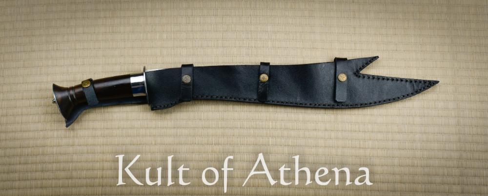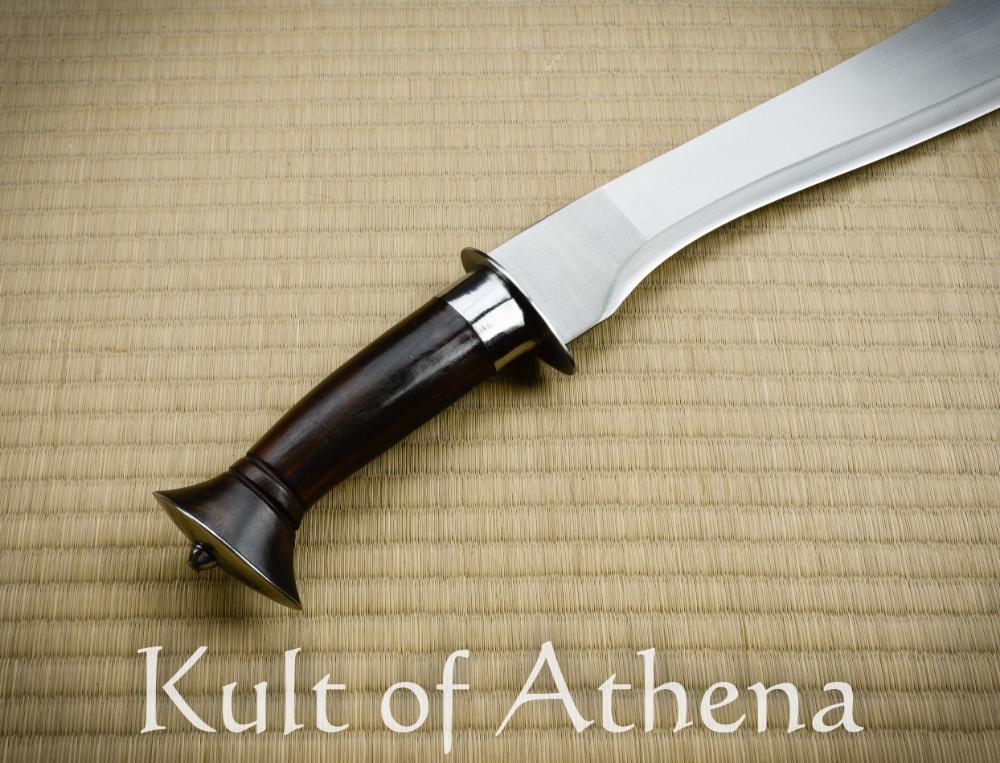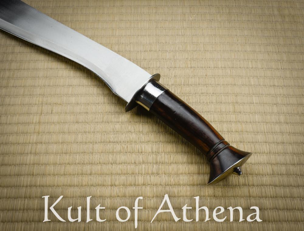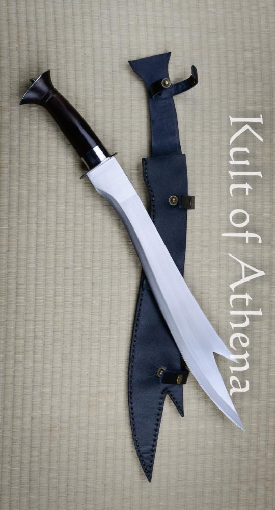 This Filipino Moro Laring Sword is crafted by Everest Forge of Nepal; the Laring is a short and aggressively shaped sword purpose-built for impactful cuts and powerful puncturing thrusts in close quarters and this replica is a great addition to the collection of a backyard test cutter or collector. The blade is crafted from 5160 high carbon steel and its thick spine gives it plenty of rigidity for durability and to make it a fierce puncturing blade. The hilt has a guard and pommel of steel and the grip is smoothly polished wood. The full length tang is peened over the pommel the secure the sword in its hilt. Included is a thick leather sheath with stitched construction, a belt loop for wear and buttoned retaining straps.