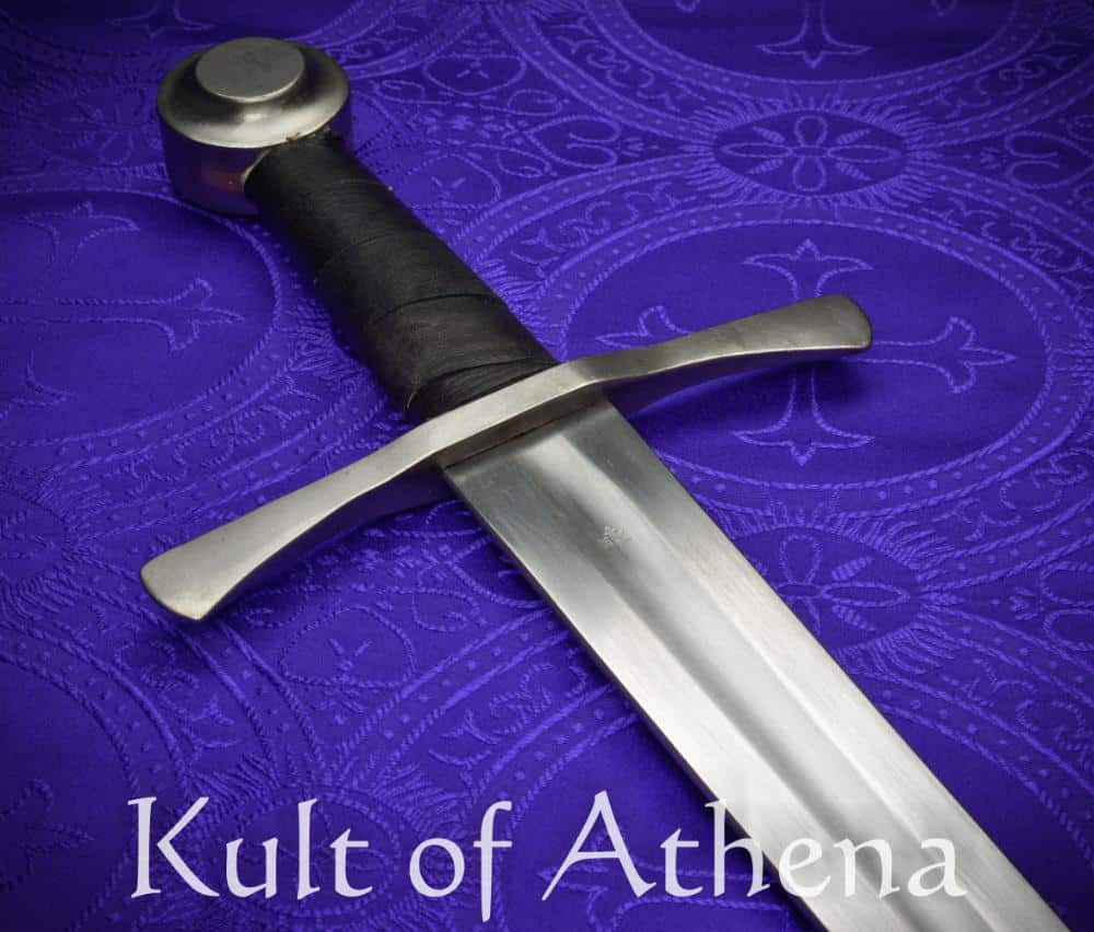 This classically styled medieval gothic arming sword is built for hard-hitting sport and stage combat and its blade is well tempered to a 50 HRc for a fine balance between durability, resilience and wear resistance. The edges of the 29″ blade are thick, blunted and rebated to allow it to withstand repetitive blade on blade contact. The ones offered here at Kult of Athena come with the “Battle” version blade option which is a classic and thickly blunted sport and stage combat sword built for heavy and repetitive impacts and is an ideal blade for HMB sport fighting, as well as heavier armored combat and energetic and hard-hitting stage combat.