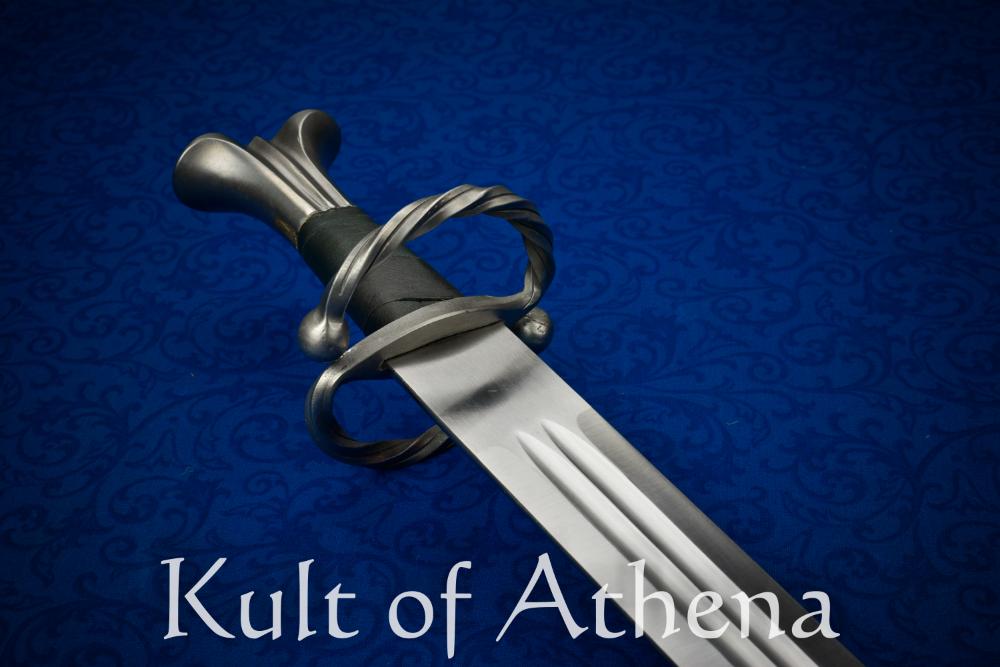 This Katzbalger is tough, dependable and ready to take and dish out the hardest hits in a form optimized for heavy armored sport combat or frenetic stage combat. Like historical originals, this famed sidearm of the Landsknecht mercenaries was designed for fighting in the close quarters combat between tight formations of men armed with pikes, halberds and swords. The wide and short blade is optimized for durability and giving more mass in the blade to give the sword a dominating presence in the parry and bind – its shorter length keeps it from getting entangled among a hedgehog mass of pole weapons. The large S-Guard quillons are visibly overbuilt compared to many other swords, but this is entirely deliberate and ensures that the sword can take glancing impacts from heavier and powerful polearms or large swords and continue to protect the hand reliably.