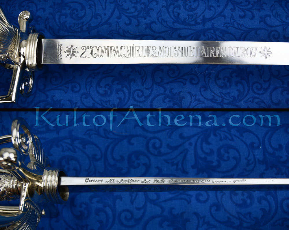 Replicated from an original, the blade is etched on both sides with 2nd Compaignie Des Mosquetaires Du Roy – which roughly translates to 2nd Company of the Royal Musketeers. Included are makers marks, as well as forge signature along the spine of the blade.