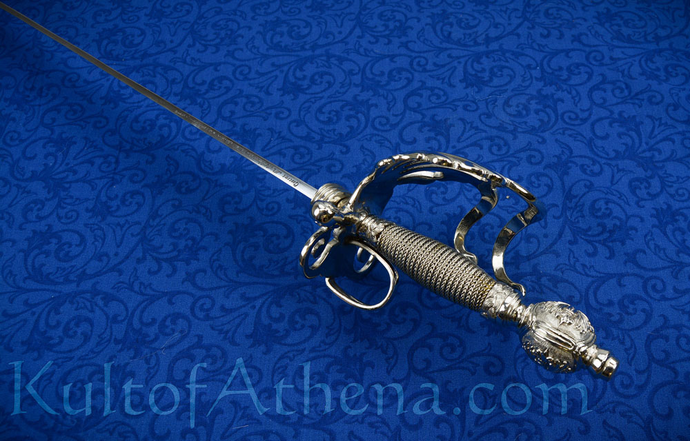 This French Musketeers Heavy Cavalry has a blade forged from 1055 high carbon steel; the clamshell hilt is crafted from nickel plated brass with a brilliant, polished finish. The wooden grip is bound in braided steel wire and the tang of the sword is stoutly peened over the pommel.