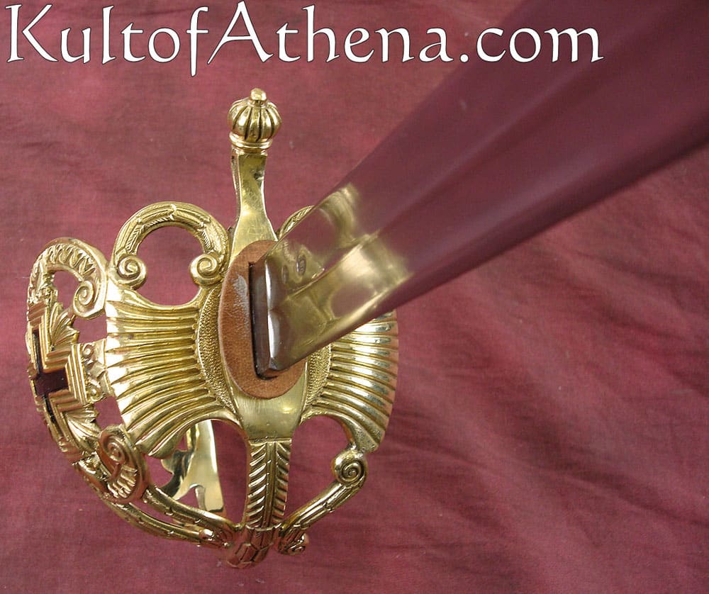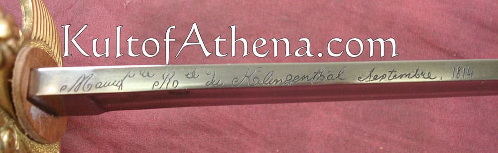 This Musketeer sword is a recreation of the blades carried by the Musketeers after their 1814 reformation. The spine of the blade bears the dated 1814 signature of the Klingenthal manufactory – the favored swordmaker of France during both the Monarchy and the Napoleonic Empire. The base of the blade is stamped with period production and inspection markings. The unsharpened blade is crafted from tempered high carbon steel and the elaborate hilt is of cast brass with a blackened cross design on the swept hilt guard. The grip is covered in tight black leather and is overlaid with spiralled brass wire. The scabbard is of steel with two steel hanging rings.