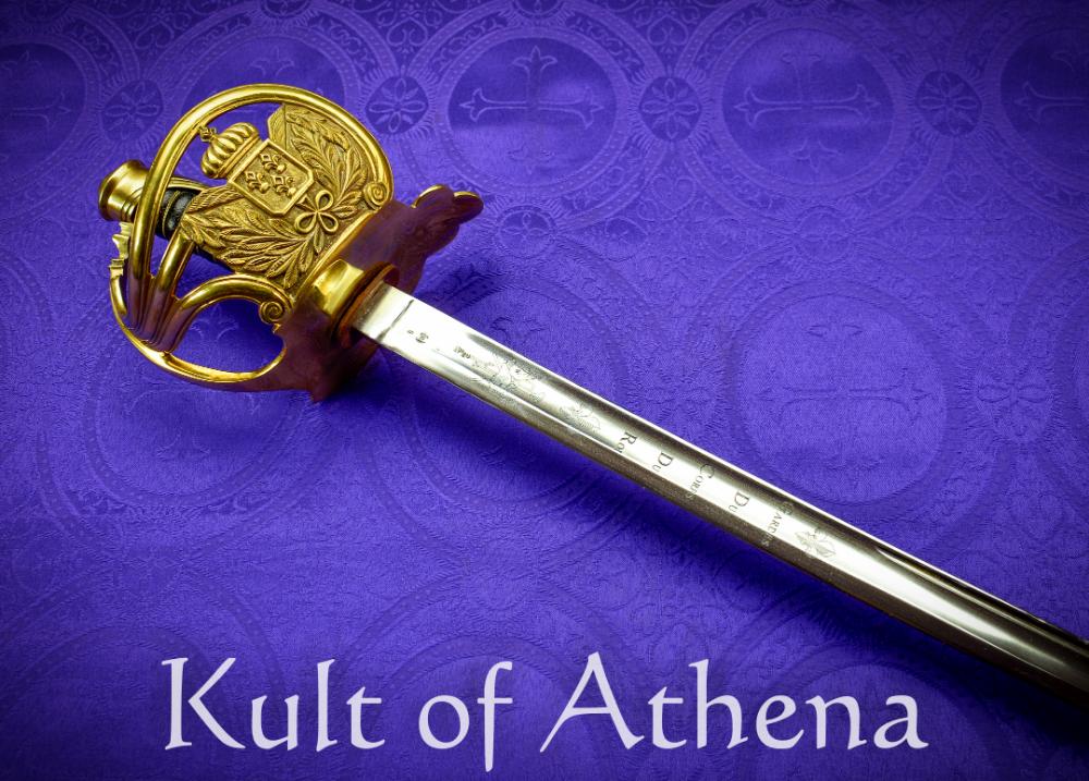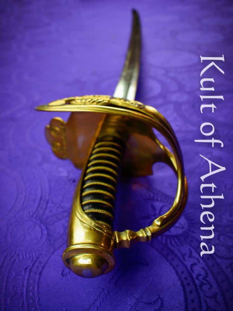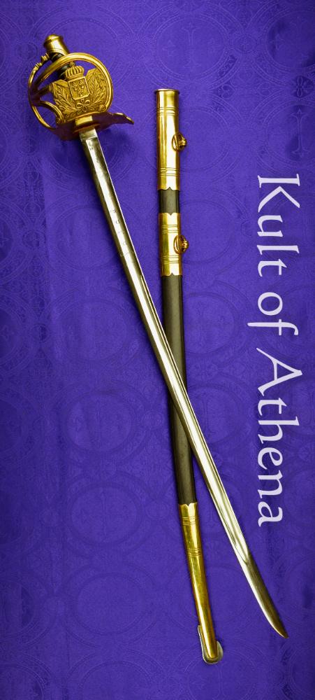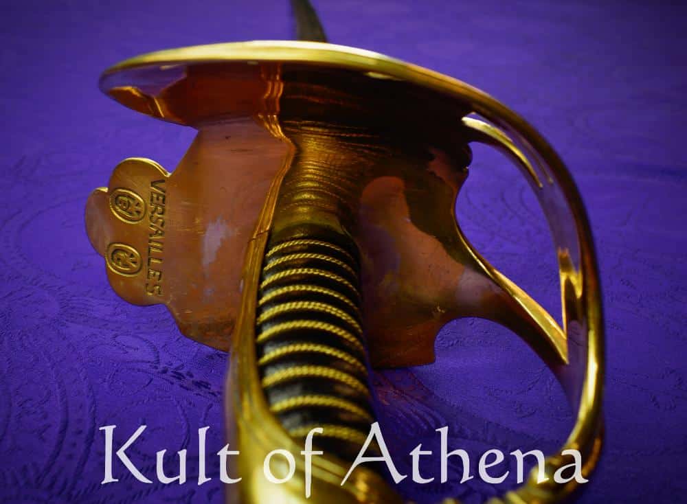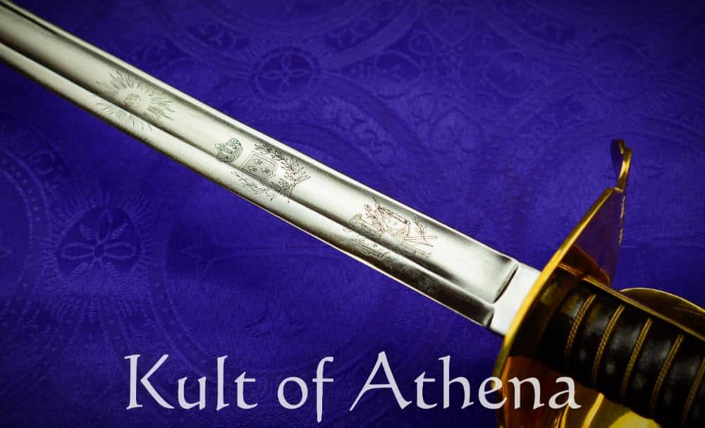 This recreated saber of the Garde Du Corps has an unsharpened blade of tempered high carbon steel. The blade bears regal inscriptions identifying it as a sword of the royal bodyguard alongside the royal devices of the fleur-de-lis and the sun. The hilt is of cast brass and the grip is covered in tight black leather overlaid with spiralled brass wire. The inside of the hilt bears the inscription of the manufactory at Versailles alongside two recreated manufacturer and inspection markings. The hard-core scabbard is of wood overlaid with black leather and brass accents and two brass hanging rings.