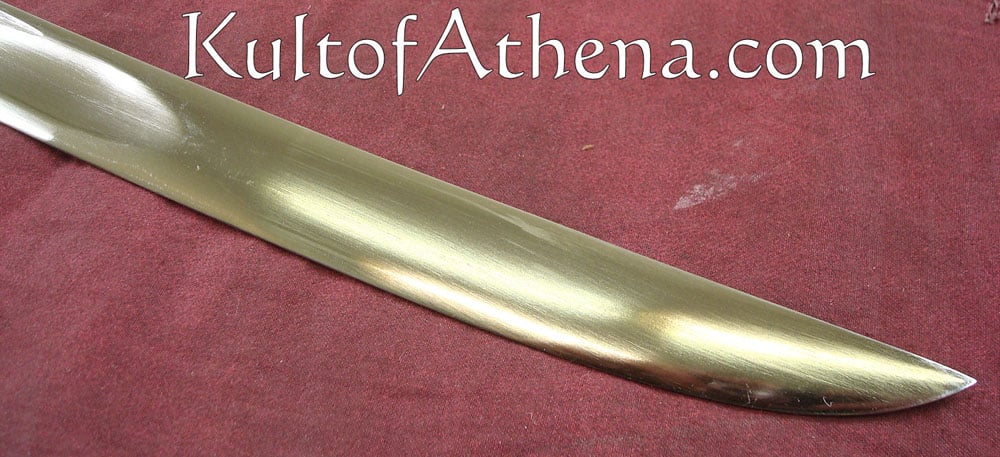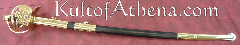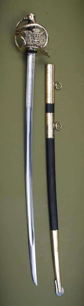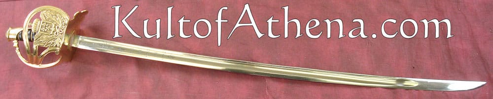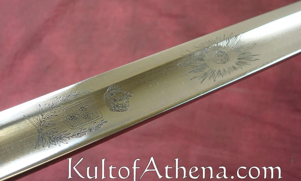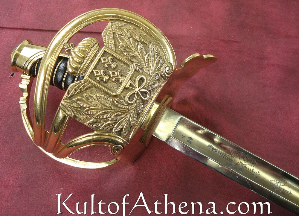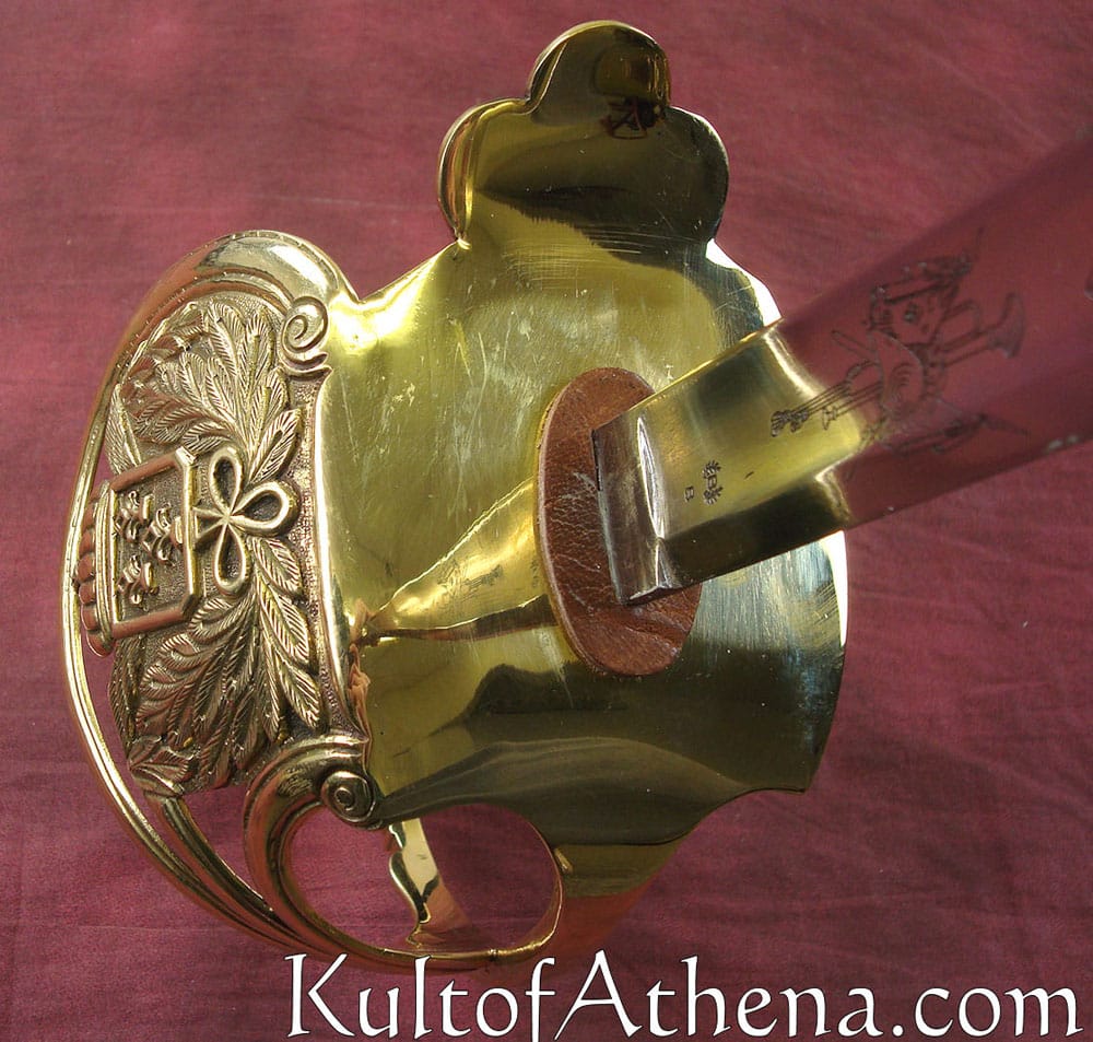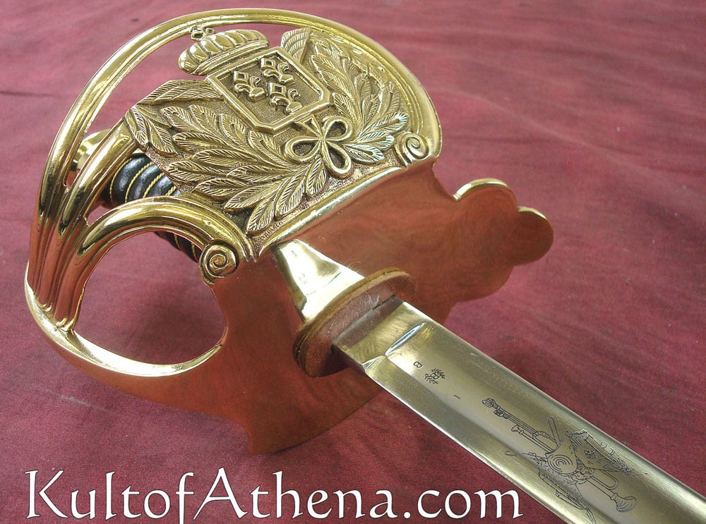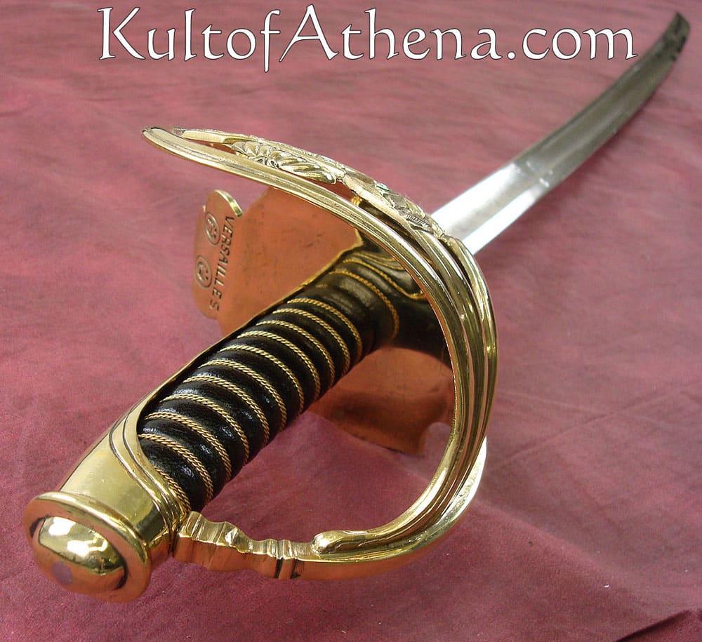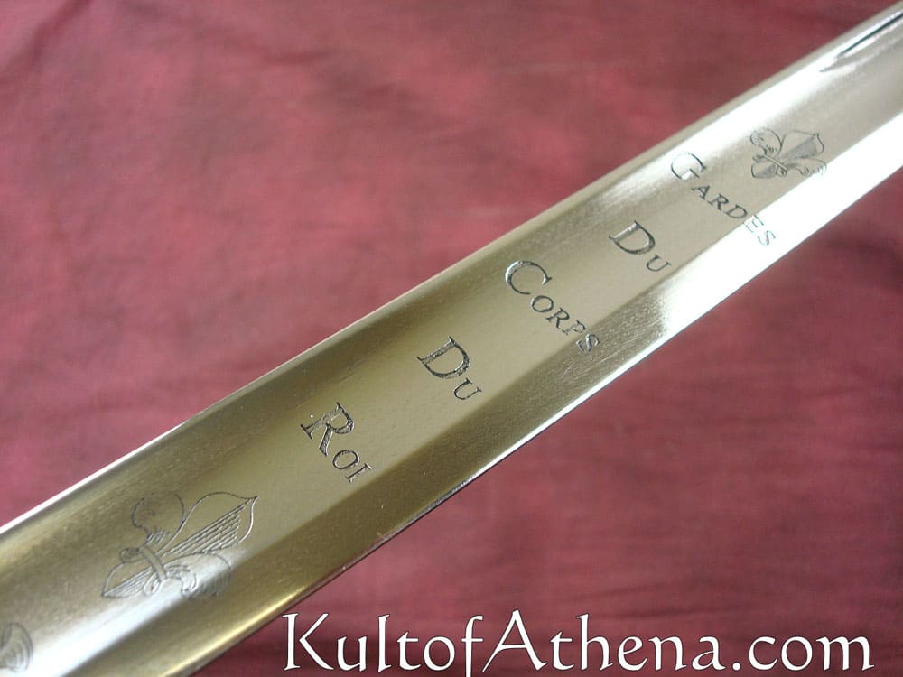This recreated saber of the Garde Du Corps has an unsharpened blade of tempered high carbon steel. The blade bears regal inscriptions identifying it as a sword of the royal bodyguard alongside the royal devices of the fleur-de-lis and the sun. The hilt is of cast brass and the grip is covered in tight black leather overlaid with spiralled brass wire. The inside of the hilt bears the inscription of the manufactory at Versailles alongside two recreated manufacturer and inspection markings. The hard-core scabbard is of wood overlaid with black leather and brass accents and two brass hanging rings.