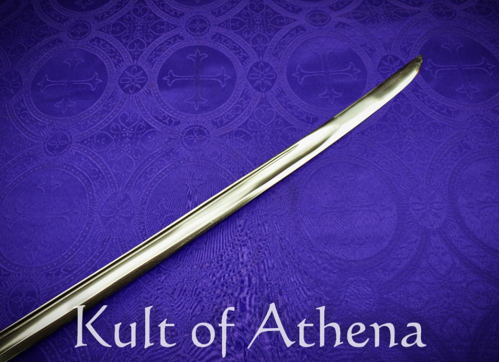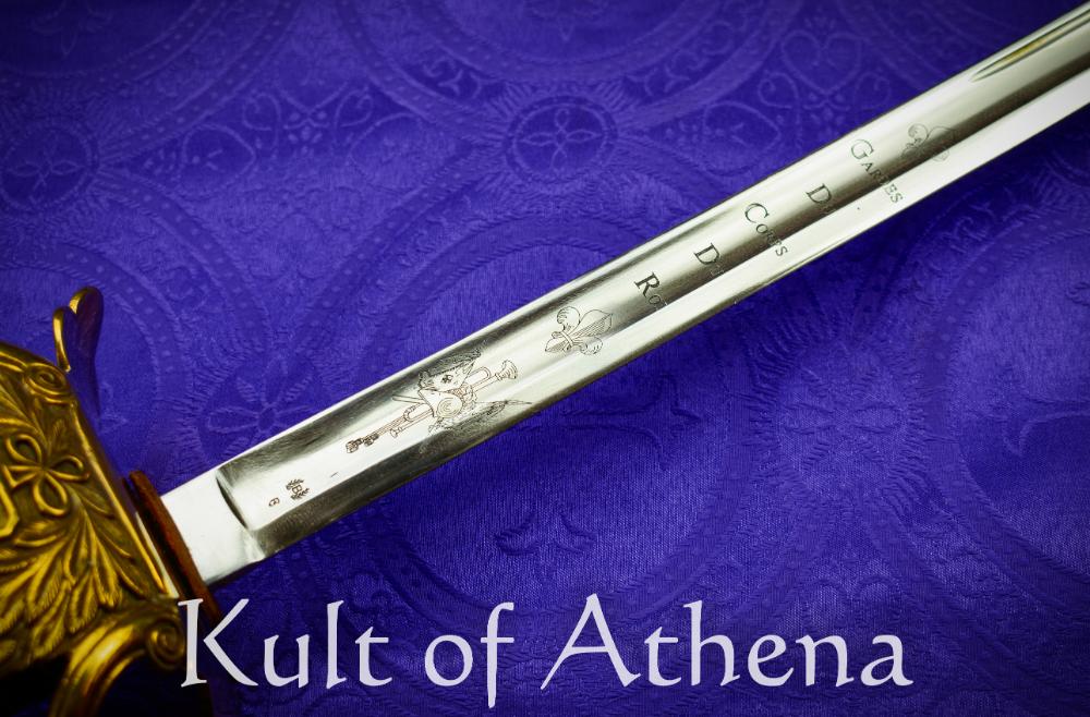 This recreated saber of the Garde Du Corps has an unsharpened blade of tempered high carbon steel. The blade bears regal inscriptions identifying it as a sword of the royal bodyguard alongside the royal devices of the fleur-de-lis and the sun. The hilt is of cast brass and the grip is covered in tight black leather overlaid with spiralled brass wire. The inside of the hilt bears the inscription of the manufactory at Versailles alongside two recreated manufacturer and inspection markings. The hard-core scabbard is of wood overlaid with black leather and brass accents and two brass hanging rings.