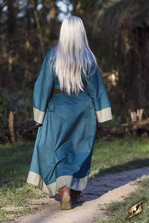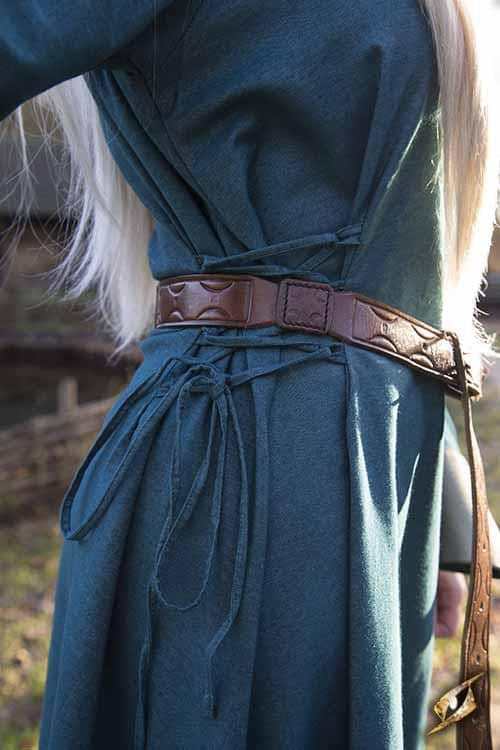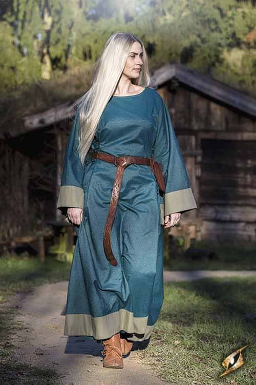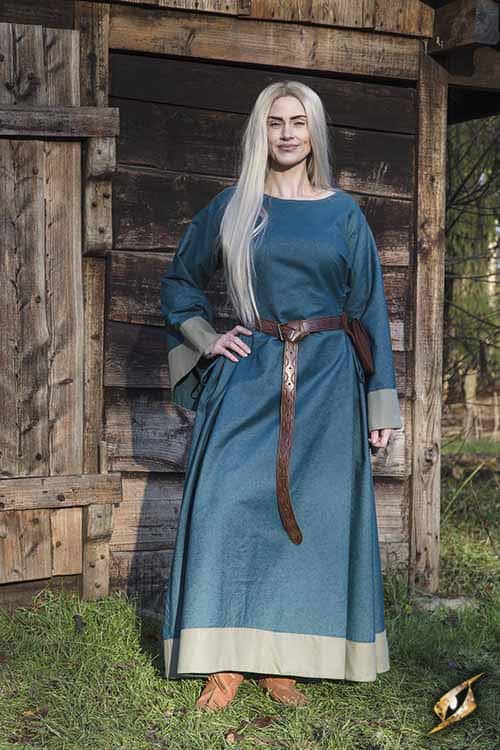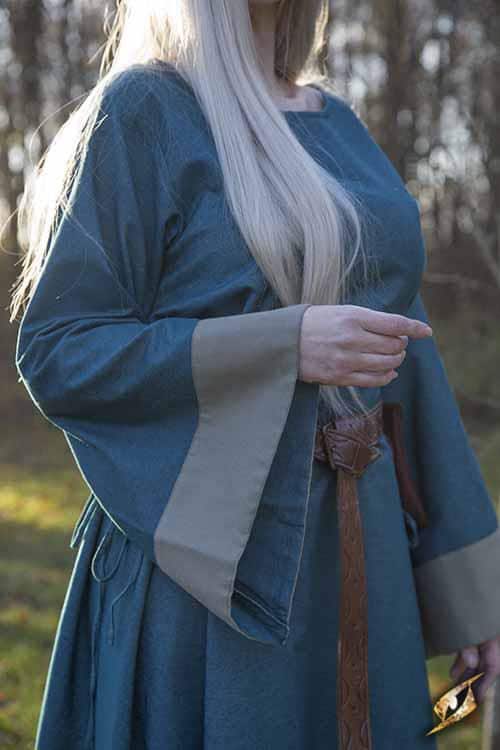 Epic Armourys Freya Dress is a simple slip-on dress with long sleeves and a boat neckline. Designed to serve as a base layer for a more complex costume, this dress can also function as a costume on its own. The dress reaches from the shoulders to the ankles and has a wide skirt with plenty of room, making movement easy. The sleeves are wrist-long and dramatically flared.