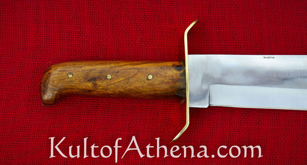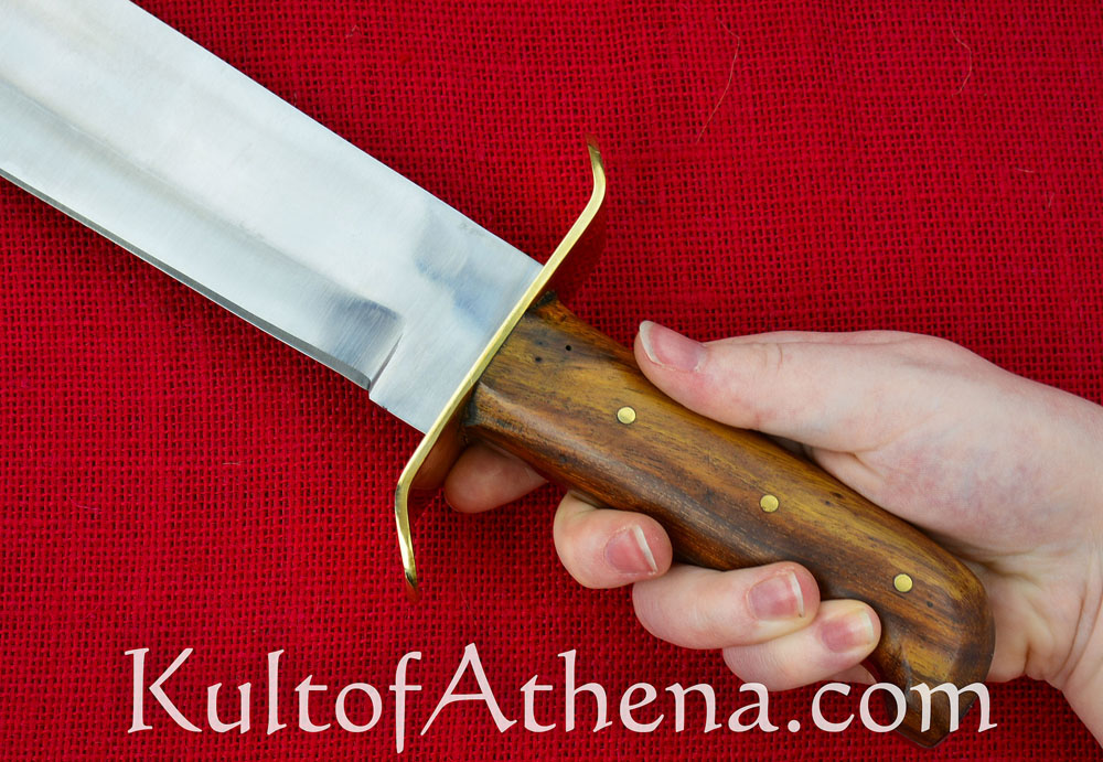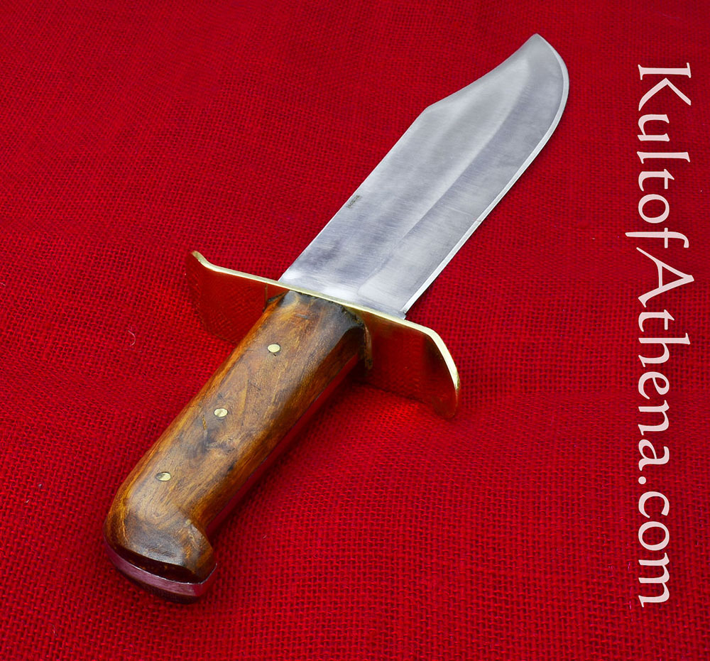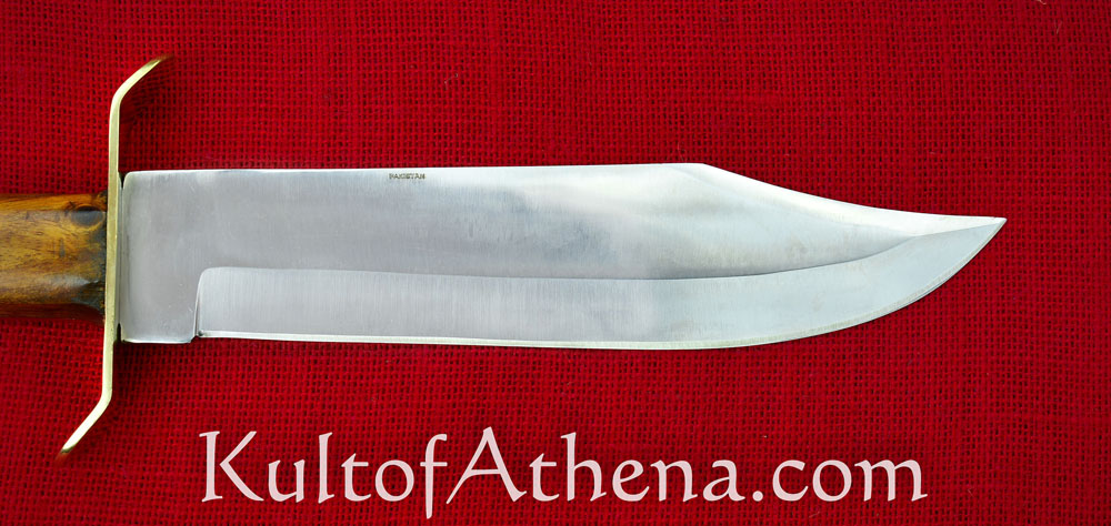 This classically styled Bowie is full of rustic frontier character and has a blade of low maintenance 420 stainless steel; its wide blade brings powerful cutting potential and the clipped point makes it a capable piercing blade as well. The guard is brass and the robust grip is formed from two grip scales of polished wood which are solidly riveted to a thick blade tang.