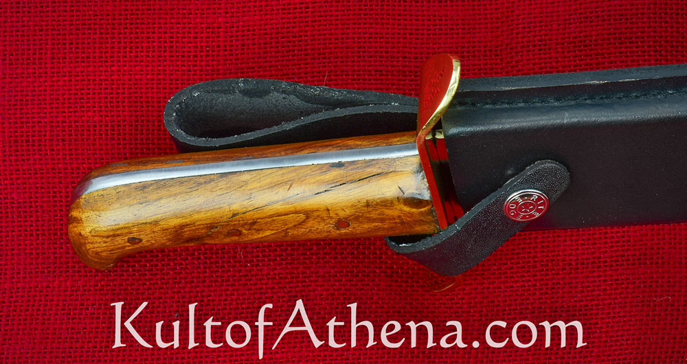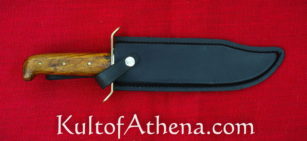 Included with the Bowie Knife is a sheath of stitched leather with an integrated belt loop and buttoned retaining strap.