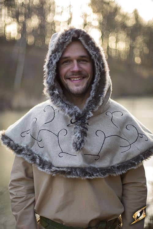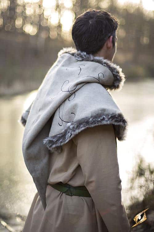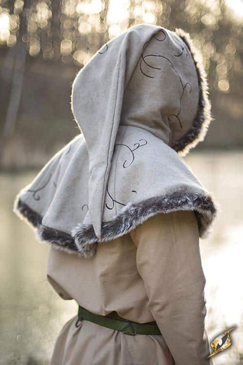 Epic Armourys Fur Hood is an embroidered mantle with a long hood tail. The mantle covers the shoulders, keeping the upper chest warm while the hood protects the head and face from harsh wind. Elvish embroidery and polyester fur trim embellishes this hood, adding great detail to the felted wool. The inside is lined with soft, comfortable cotton.