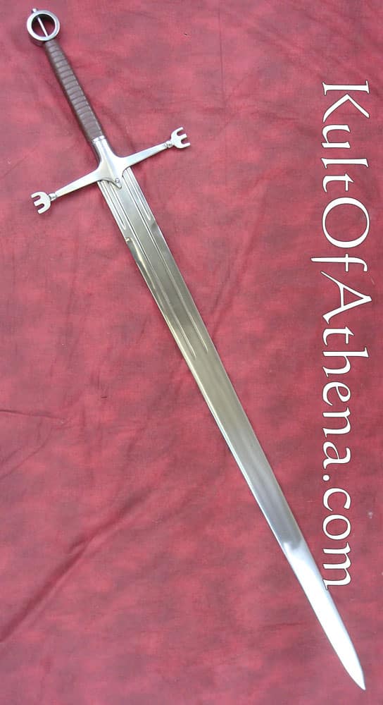 This Gallowglass sword, by Deepeeka is a large two handed sword in the Irish style with its iconic ring pommel. The blade is of high carbon steel. The hilt and pommel are of steel and the grip is wrapped in tight, brown leather.