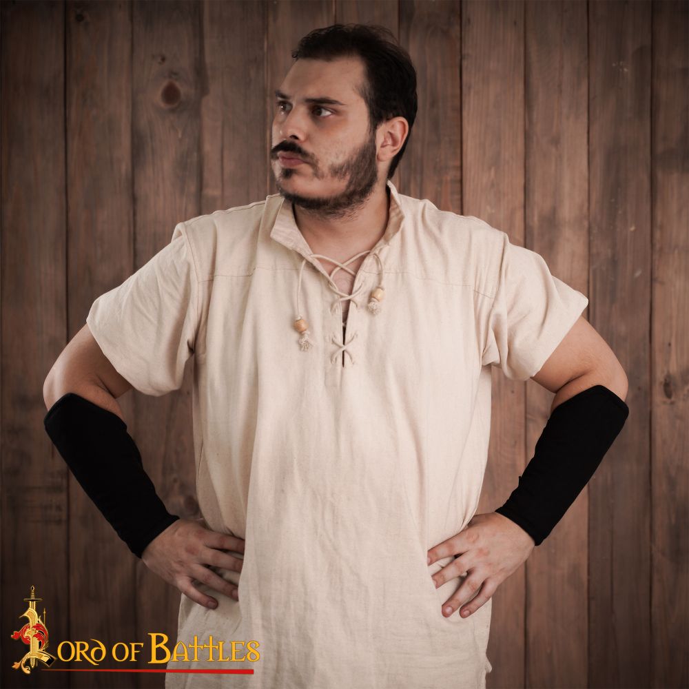 Good Value The description of these bracers is misleading as the only mention of material in the ad is cotton. The label states usage of cotton, wool, polyester, acrylic, and other. The laces are too short in the extreme, not anything like in the photo. The label also contains six symbols; I assume are instructions, that I have no idea of the significance. Contrary to the forgoing I like these and definitely have a need that they will fill nicely and worth the price, just can’t give it five stars in light of that. I can put these on myself without the aid of others helping. The trick is to discard the laces, which in my case were useless, place on forearm. I then secured with two black rubber loops per arm that I made for my slingshot to hold in place while I secured vambraces over the padded armour and tightened. Works like a champ.