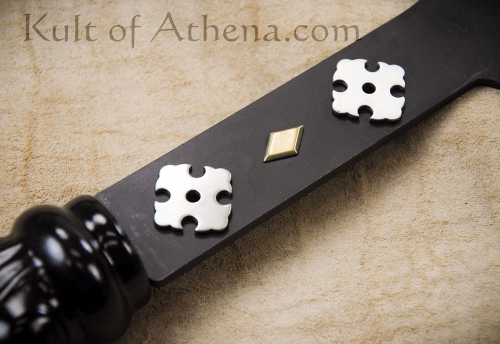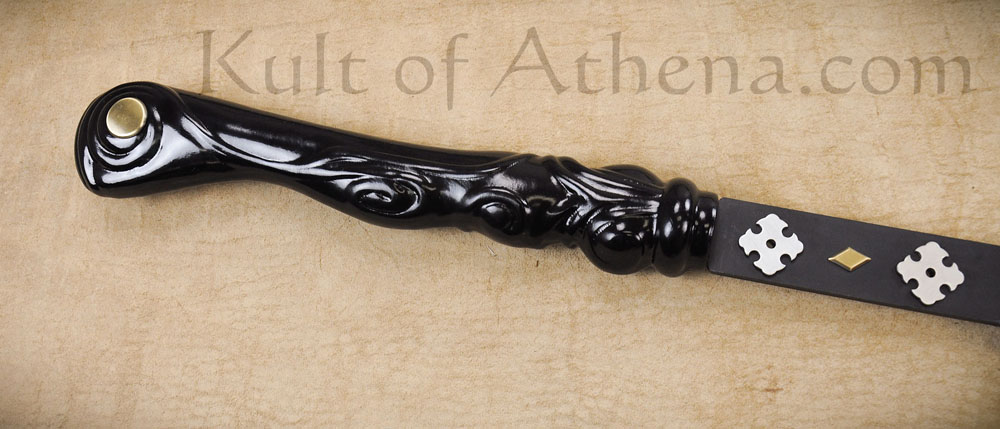The Arakh has an unsharpened blade of high carbon steel that has been darkened with a black oxide finish fitted into a long grip of elaborately carved wood that has been given an ebony black finish. The base of the blade is decorated with a pair of steel crosses and a brass diamond on both sides – the pommel is fitted with a round brass insert on both sides. The sword is marked with its production number on the blade.