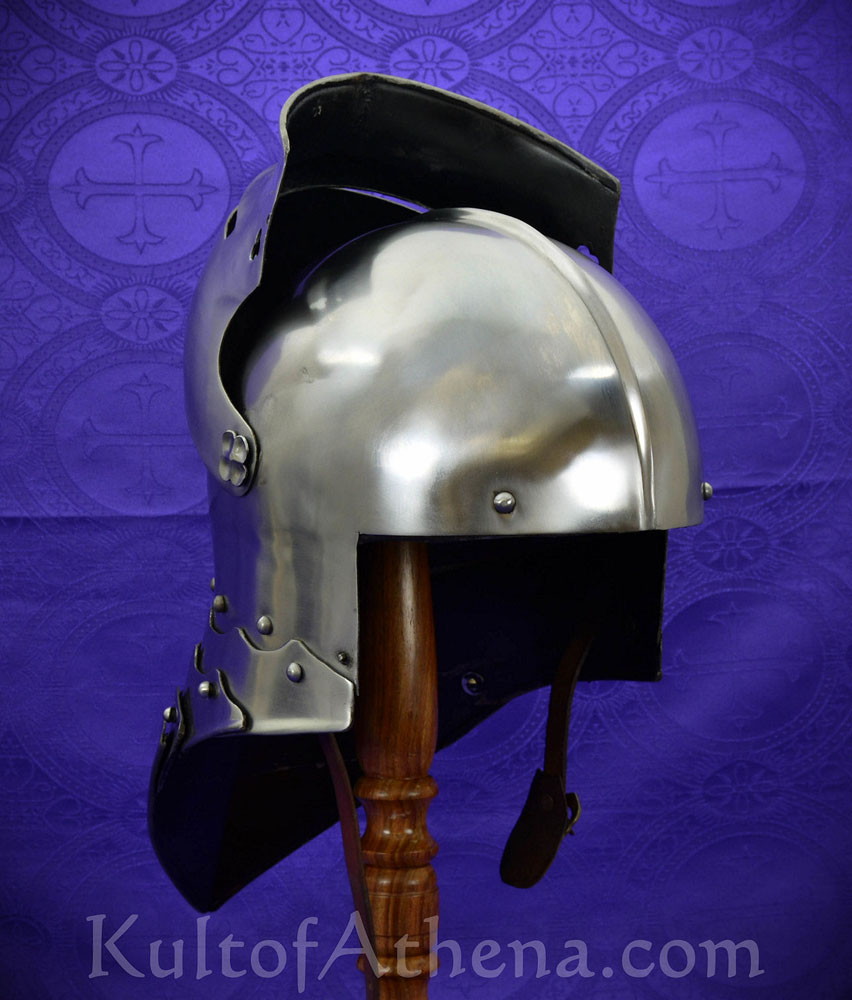 This German Sallet is crafted from 16 gauge steel and lined on the inside with an adjustable leather suspension liner. The visor can be raised and the segmented plates that protect the neck are articulated. A leather adjustable chin strap with an antiqued brass buckle complete the helm.