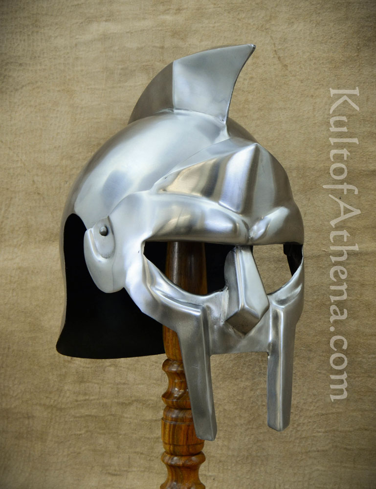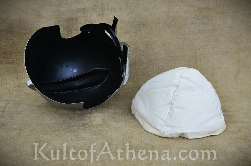 The Gladiator Helm is crafted from 18 gauge steel; the interior of the helm is blackened and unlined. Included with the helmet is a separate padded cotton arming cap.