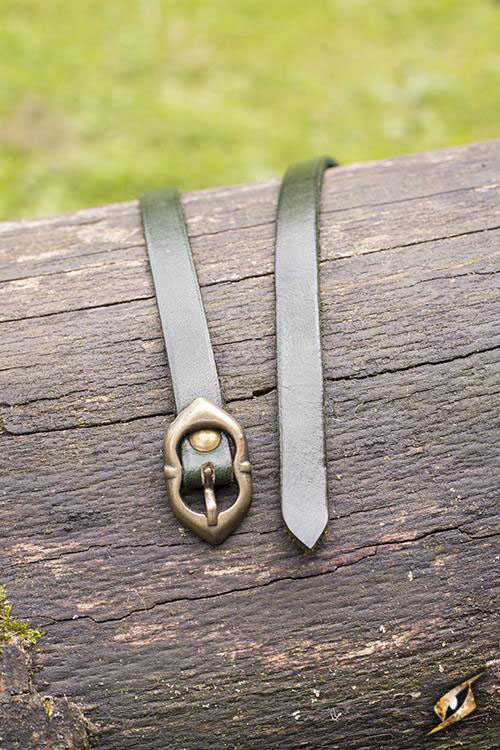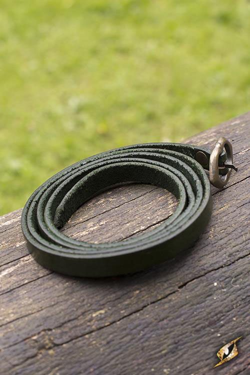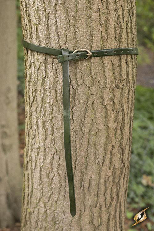 This medieval belt is crafted from thick leather and in true period style is thin and with a long enough tail to knot after the buckle. It is adjustable with its antiqued brass buckle.