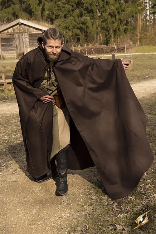 Epic Armourys Godfrey Twill Cape is an ankle-length cape with shorter sides, fitted with a hood and cotton-strap fastenings. This design offers more mobility of the arms, allowing them to easily slide from beneath the cape when hands are needed without sacrificing protection from the elements. This cape makes a great accessory if you need to add layering to your characters costume, as capes have become synonymous with medieval and fantasy clothing. Capes are also highly practical in limiting the impact of wind, rain or sun.