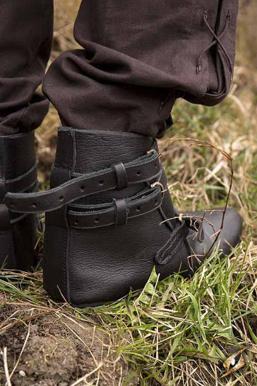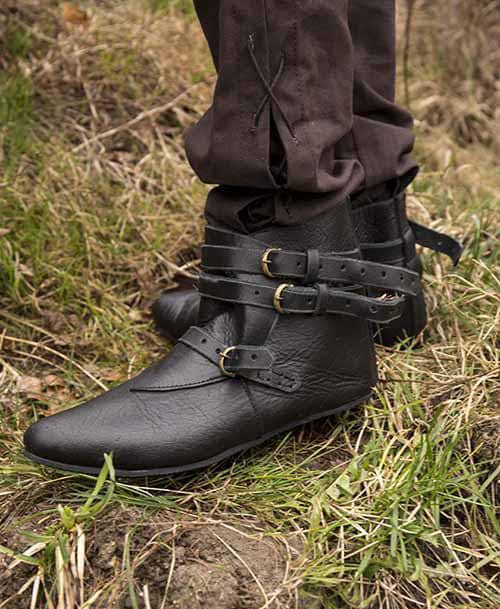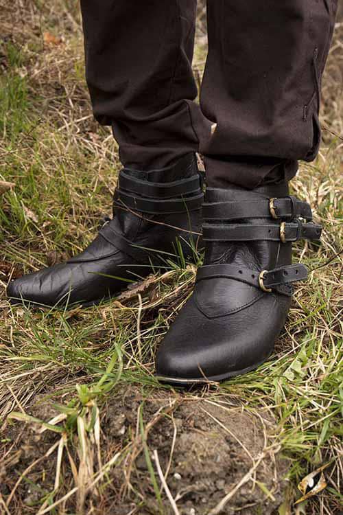 Epic Armourys Black Shoes Godfrey are classically styled shoes ideal for a noble, merchant, or high-class adventurer. Made from tough, yet supple black leather and a rubber outsole, this shoe is handmade to withstand the abuse of adventure while still offering comfortable support around the ankle. Easily slide these shoes onto your feet, adjusting the fit using three straps and brass buckles across the ankle and foot.