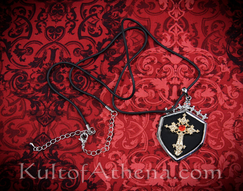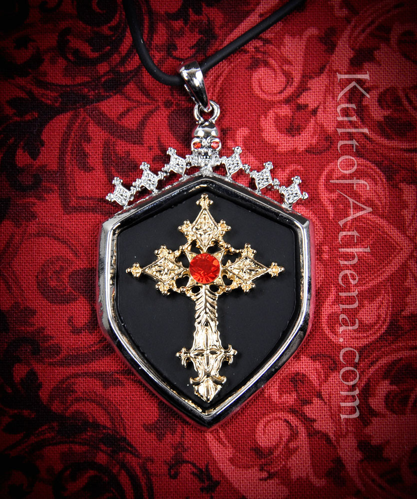 This large shield pendant is boldy emblazoned with an intricate gothic cross and a central red crystal. Its back and frame are of stainless steel and the shield is topped with a leering skull with inset eyes of red crystal. The pendant is accompanied with a faux leather cord that is closed with a clasp and extension chain.