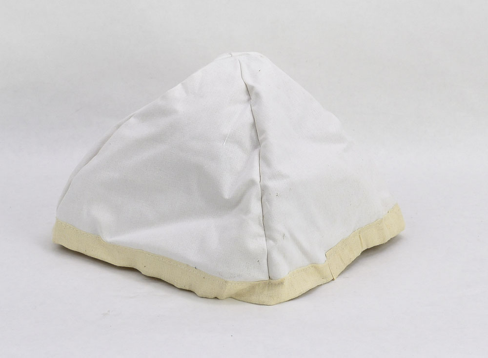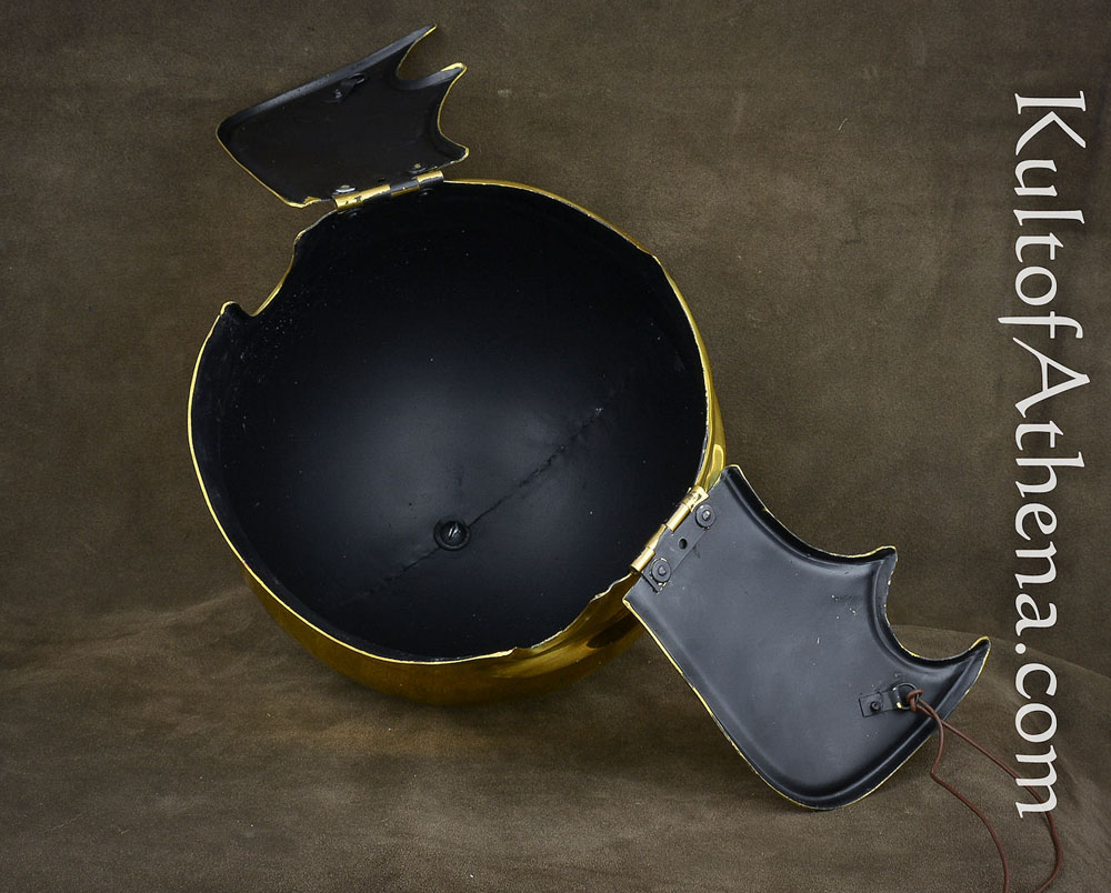 This Greek Attic helmet is crafted from brass and fitted with hinged cheek plates. Integrated rings on the cheekplates allow for a chin strap to be tied on and used to secure the helmet and the position of the cheekplates. The interior of the helmet is blackened and unlined. Included is a separate padded arming cap which can be worn beneath the helmet.
