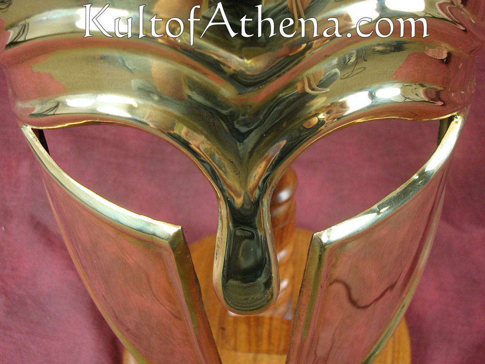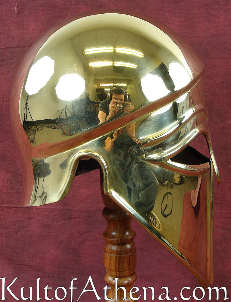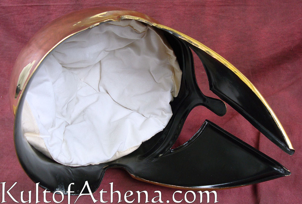 The Corinthian style helmet favored by ancient Greeks enjoyed a long period of use, from the early 7th to the 4th Century B.C. This simple yet elegant design helmet could be pushed back to rest on the head when not in use, allowing view of the face and is portrayed in many Greek works of art. This version is made of solid brass and dates between 600-550 BC. Though unlined, it comes with a padded natural color cotton arming cap.