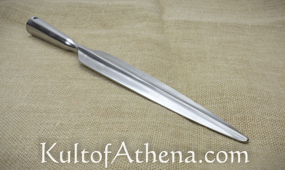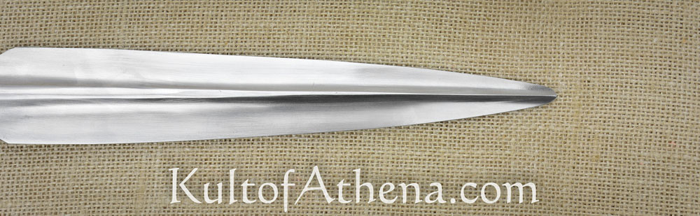 This Greek Spearhead is forged from steel and is ready to be mounted atop your own wooden spear pole to finish your own Dory spear. It has two pre-drilled holes which allow you to screw or nail it onto the tapered haft end to reinforce and secure its mounting. Fastening hardware is not included.