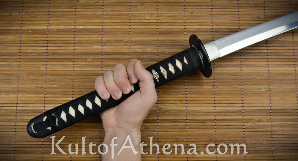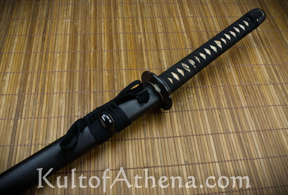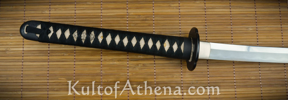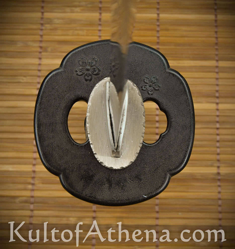 The wooden tsuka grip is inlaid with panels of genuine rayskin and bound in knotted black tsuka-ito cord with silver cherry blossom menuki firmly fitted beneath the folds. The saya scabbard is carved to fit from wood and is coated in a textured black lacquer complete with buffalo horn fittings. A knotted sageo cord completes the saya. Included with the sword is a cloth sword bag.