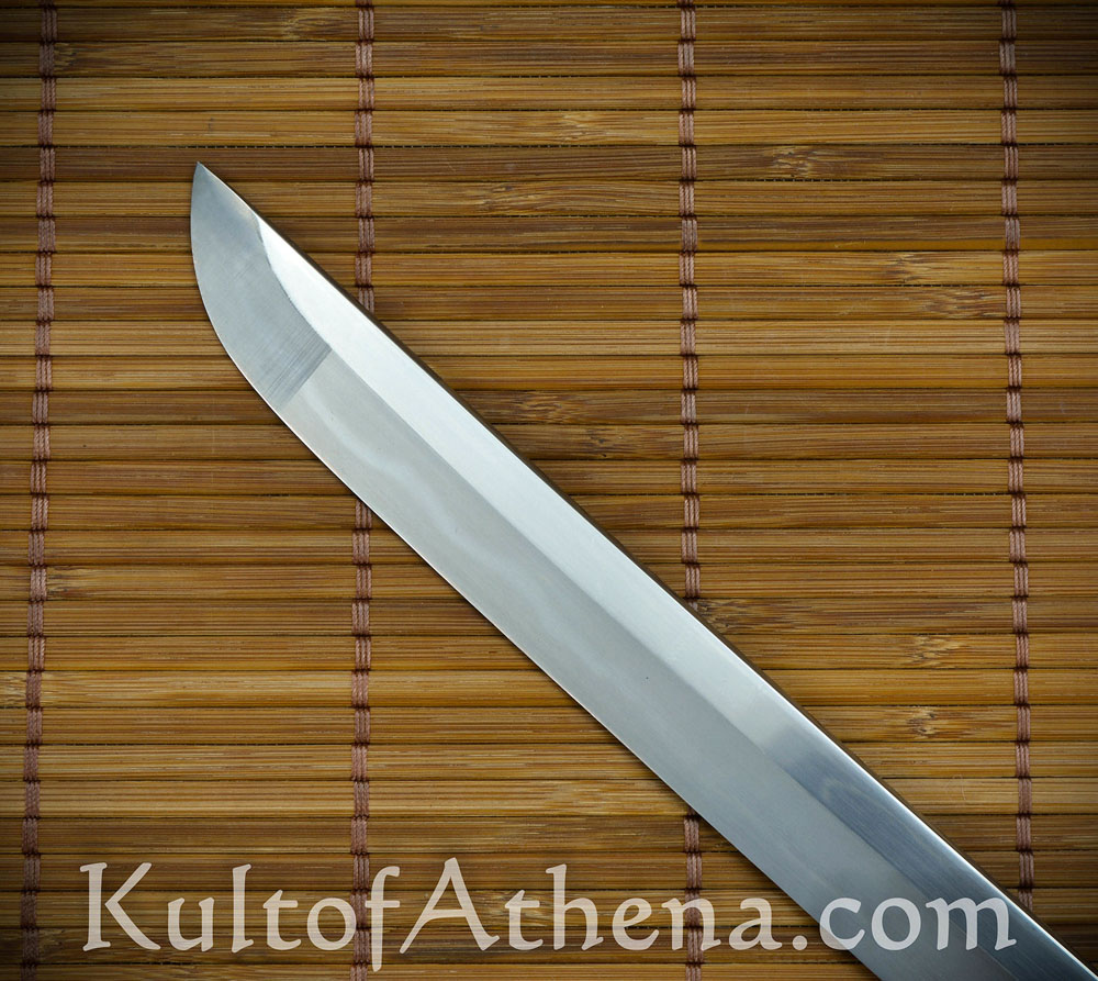 The good: The balance is excellent. Moving from strike to guard is easy and kata are smooth. The grip is a little narrow, but comfortable in both one or two hands. Everything (except the kashira/end cap) is solid in place. The ito/cord wrap does not move without really reefing on it. This blade sings in the hand. Despite having no bo-hi/fuller you can get a good “whoosh” or tachi-kaze/blade-wind from a proper swing. The fit in the saya/scabbard is pretty much perfect. Once slid in all the way it holds solidly even when shaken upside-down but you can still push the tsuba/guard forward with your thumb to pop it forward before you draw.