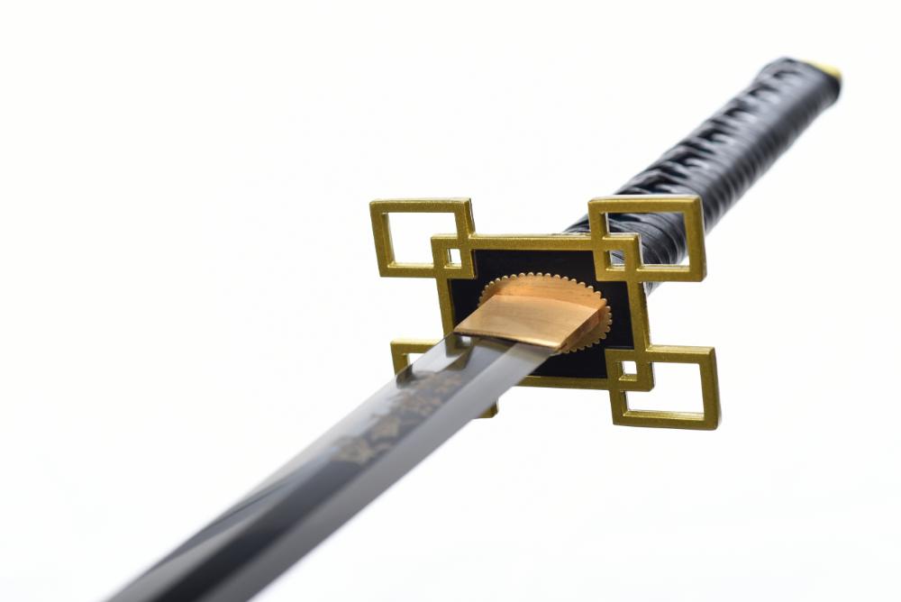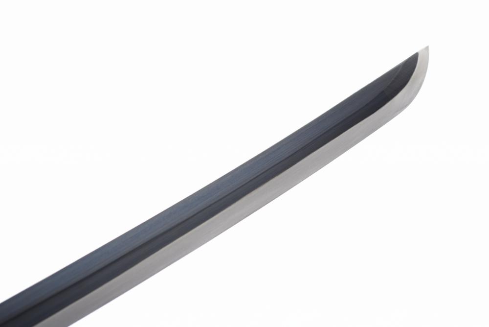The 28.5-inch blade is forged from tempered T10 steel to provide an edge capable of real cutting performance. Its smooth, mist-themed finish created from selectively bluing the blade mirrors Muichiro’s iconic Nichirin blade while retaining the strength and resilience of a fully functional sword. A full-length katana tang anchors securely into a 9.75-inch wooden tsuka wrapped in tightly fitted leather ito for a confident grip; beneath the wrap lie genuine rayskin samegawa panels. The tsuba and all hilt components are constructed from solid metal, giving the sword notable strength and a premium feel far superior to the molded plastics often found on display-only replicas. With an overall length of 39.5 inches, the sword achieves an elegant profile with the balance and cutting ability expected from a real katana. Included is a carved wooden scabbard with a blackened finish and brass-hued metal components to match the sword. Also included is a gift display box and a brocade sword bag.