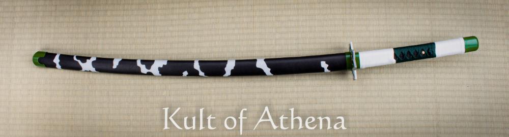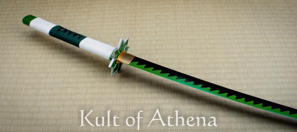The 28 3/4″ blade is forged from tempered steel to produce a resilient, wear-resistant edge supported by a durable spine capable of absorbing shock and maintaining structural integrity under stress. Its finish is clean and functional, reflecting Sanemi’s no-nonsense, straightforward style. A full-length katana tang is securely fitted into a tsuka wrapped in just over 9 inches of tightly bound white and dark green ito cord, providing a confident, secure grip suited for precise cuts, vigorous practice, or display. The tsuba and all metal fittings are solid and well-crafted, significantly more substantial than the plastic components found on lower-quality replicas — giving the sword a durable, weighty feel and a lasting build quality.
