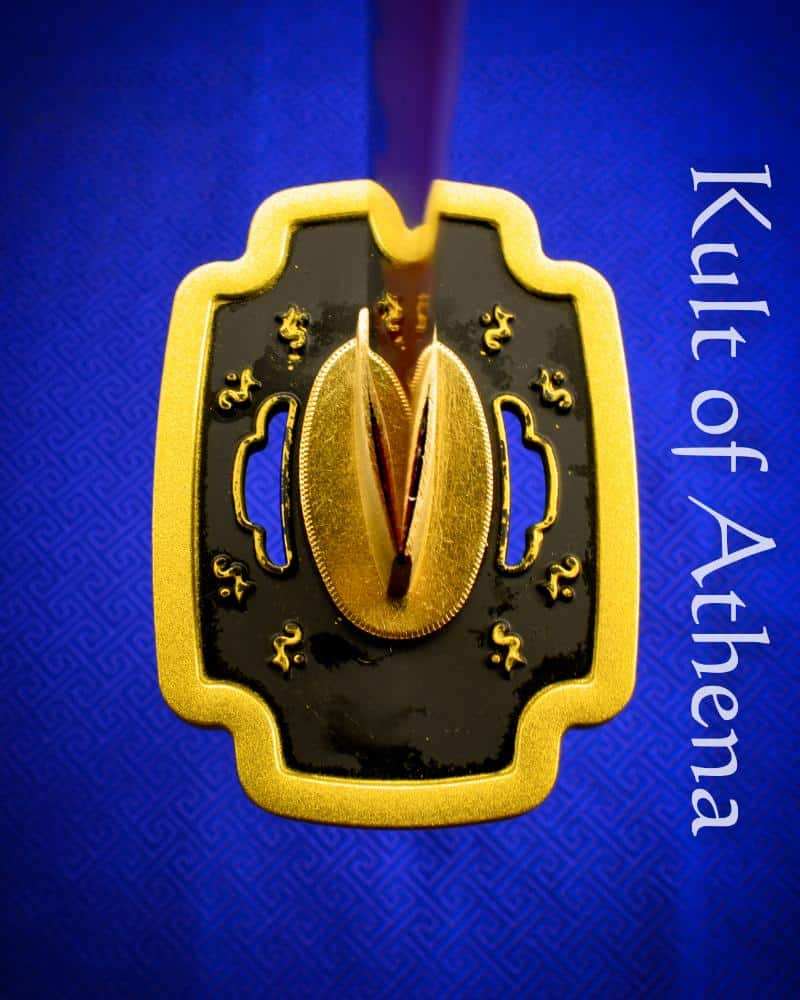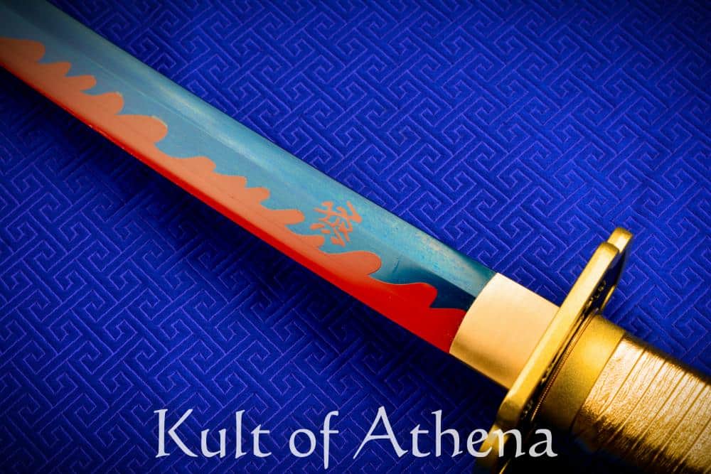 The 28 1/2″ blade is forged from tempered T10 steel, giving it a hardened, wear-resistant edge supported by a resilient spine for durability and shock absorption. The blade’s deeply blued and crimson hamon finish pay homage to Yoriichi’s timeless design — altogether elegant yet powerful. A full-length tang secures the blade into a tsuka wrapped by about 9 inches of tightly bound leather cord, providing a firm, comfortable grip ideal for precise handling during practice or display. The tsuba and hilt components are crafted from solid metal giving the sword substantial strength and a premium feel far beyond plastic fittings common to lesser replicas. Included is a lacquered wooden scabbard featuring black matte lacquer and burnished metal accents that complement the sword’s overall design. A decorative gift box and a brocade sword bag are also included to complete the sword, as well as a manufacturer’s production certificate.