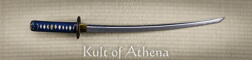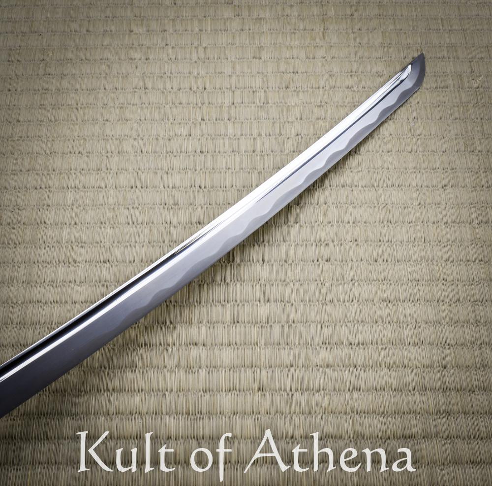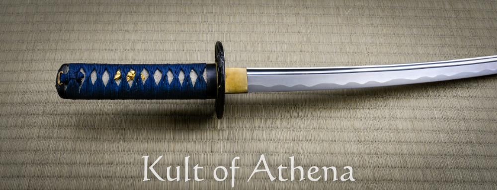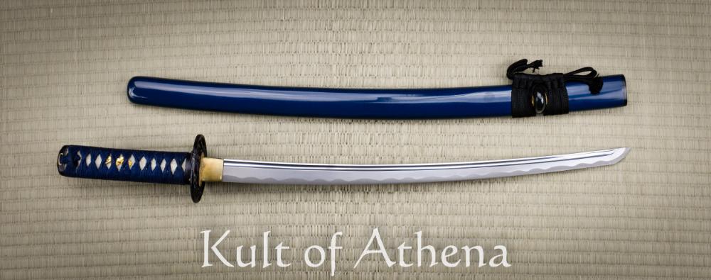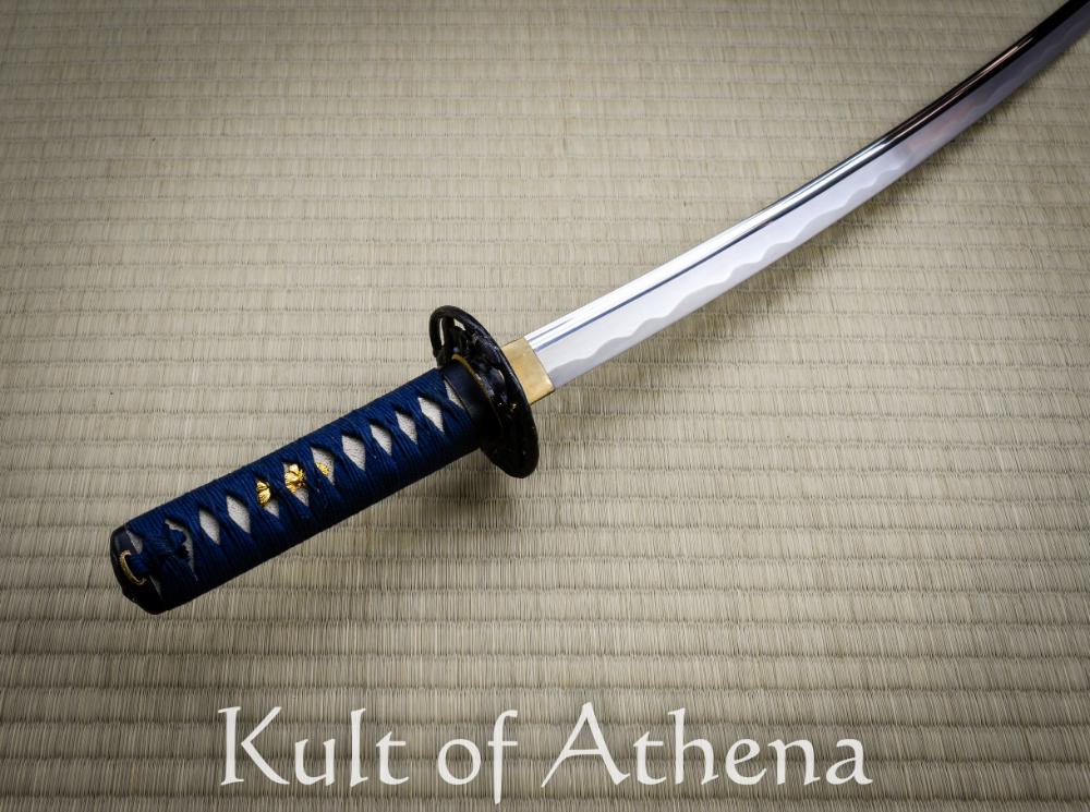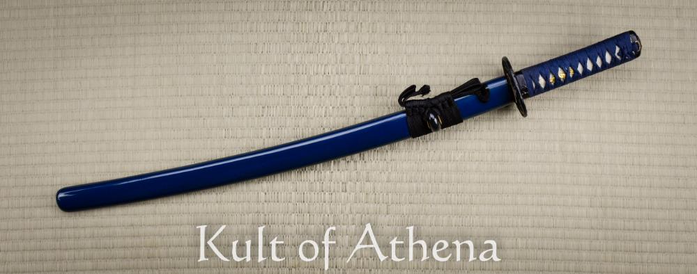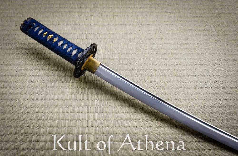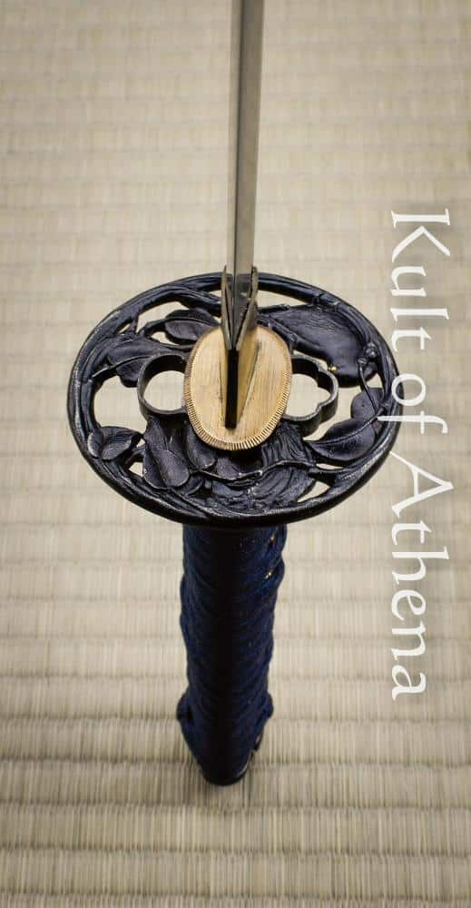 The Hanwei Golden Oriole Wakizashi features a sharpened high carbon steel blade with deep bohi. The wood handle is covered in genuine rayskin with blue Japanese cotton cord wrap. The cast metal tsuba depicts a mantis stalking a cricket, unaware that he himself is being stalked by the Golden Oriole. Includes a wooden scabbard with dark blue lacquer finish, cleaning kit and cloth storage sleeve.